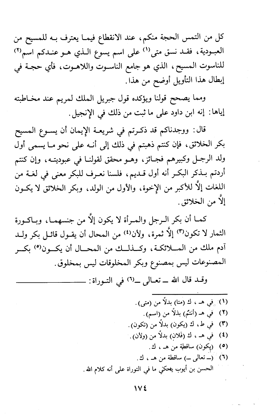 قَالَ: وَوَجَدْنَاكُمْ قَدْ ذَكَرْتُمْ فِي شَرِيعَةِ الْإِيمَانِ: أَنَّ يَسُوعَ الْمَسِيحَ بِكْرُ الْخَلَائِقِ، فَإِنْ كُنْتُمْ ذَهَبْتُمْ فِي ذَلِكَ إِلَى أَنَّهُ عَلَى نَحْوِ مَا يُسَمَّى أَوَّلُ وَلَدِ الرَّجُلِ وَكَبِيرُهُمْ فَجَائِزٌ، وَهُوَ مُحَقِّقٌ لِقَوْلِنَا فِي عُبُودِيَّتِهِ، وَإِنْ كُنْتُمْ أَرَدْتُمْ بِذِكْرِ الْبِكْرِ أَنَّهُ أَوَّلُ قَدِيمٍ، فَلَسْنَا نَعْرِفُ لِلْبِكْرِ مَعْنًى فِي لُغَةٍ مِنَ اللُّغَاتِ إِلَّا لِلْأَكْبَرِ مِنَ الْإِخْوَةِ وَالْأَوَّلِ مِنَ الْوَلَدِ، وَبِكْرُ الْخَلَائِقِ لَا يَكُونُ إِلَّا مِنَ الْخَلَائِقِ.