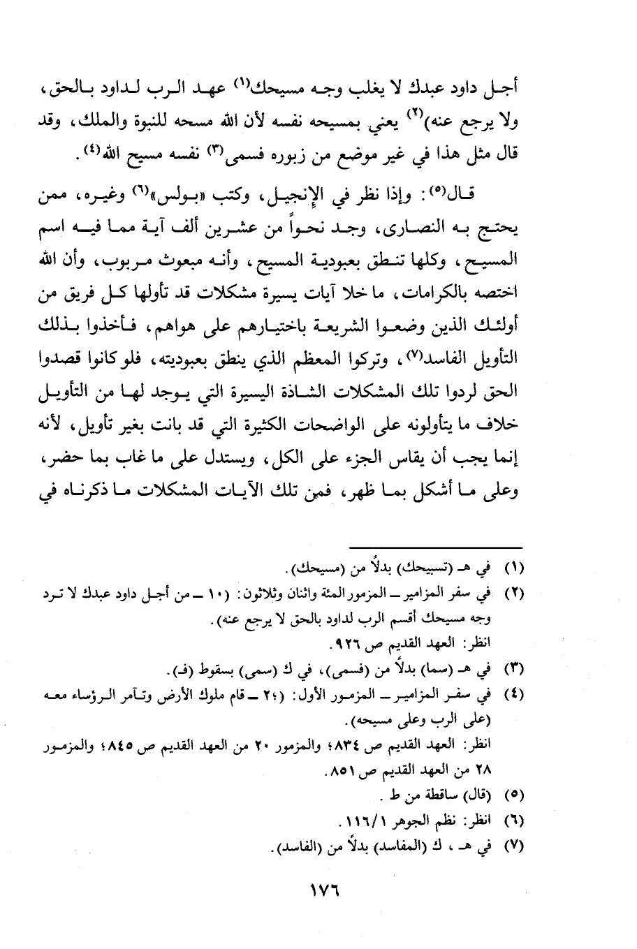 قَالَ: وَإِذَا نَظَرَ فِي الْإِنْجِيلِ وَكُتُبِ بُولُسَ وَغَيْرِهِ مِمَنْ يَحْتَجُّ بِهِ النَّصَارَى، وَجَدَ نَحَوًا مِنْ عِشْرِينَ أَلْفِ آيَةٍ مِمَّا فِيهِ اسْمُ الْمَسِيحِ وَكُلُّهَا تَنْطِقُ بِعُبُودِيَّةِ الْمَسِيحِ، وَأَنَّهُ مَبْعُوثٌ مَرْبُوبٌ وَأَنَّ اللَّهَ اخْتَصَّهُ بِالْكَرَامَاتِ، مَا خَلَا آيَاتٍ يَسِيرَةٍ مُشْكَلَاتٍ قَدْ تَأَوَّلَهَا كُلُّ فَرِيقٍ مِنْ أُولَئِكَ الَّذِينَ وَضَعُوا الشَّرِيعَةَ بِاخْتِيَارِهِمْ عَلَى هَوَاهُمْ، فَأَخَذُوا بِذَلِكَ التَّأْوِيلِ الْفَاسِدِ، وَتَرَكُوا الْمُعْظَمَ الَّذِي يَنْطِقُ بِعُبُودِيَّتِهِ، فَلَوْ كَانُوا قَصَدُوا الْحَقَّ لَرَدُّوا تِلْكَ الْمُشْكَلَاتِ الشَّاذَّةَ الْيَسِيرَةَ الَّتِي يُوجَدُ لَهَا مِنَ التَّأْوِيلِ خِلَافُ مَا يَتَأَوَّلُونَهُ عَلَى الْوَاضِحَاتِ الْكَثِيرَةِ الَّتِي قَدْ بَانَتْ بِغَيْرِ تَأْوِيلٍ، لِأَنَّهُ إِنَّمَا يَجِبُ أَنْ يُقَاسَ الْجُزْءُ عَلَى الْكُلِّ، وَيُسْتَدَلَّ عَلَى مَا غَابَ بِمَا حَضَرَ، وَعَلَى مَا أُشْكِلَ بِمَا ظَهَرَ، فَمِنْ تِلْكَ الْآيَاتِ الْمُشْكَلَاتِ مَا ذَكَرْنَاهُ فِي