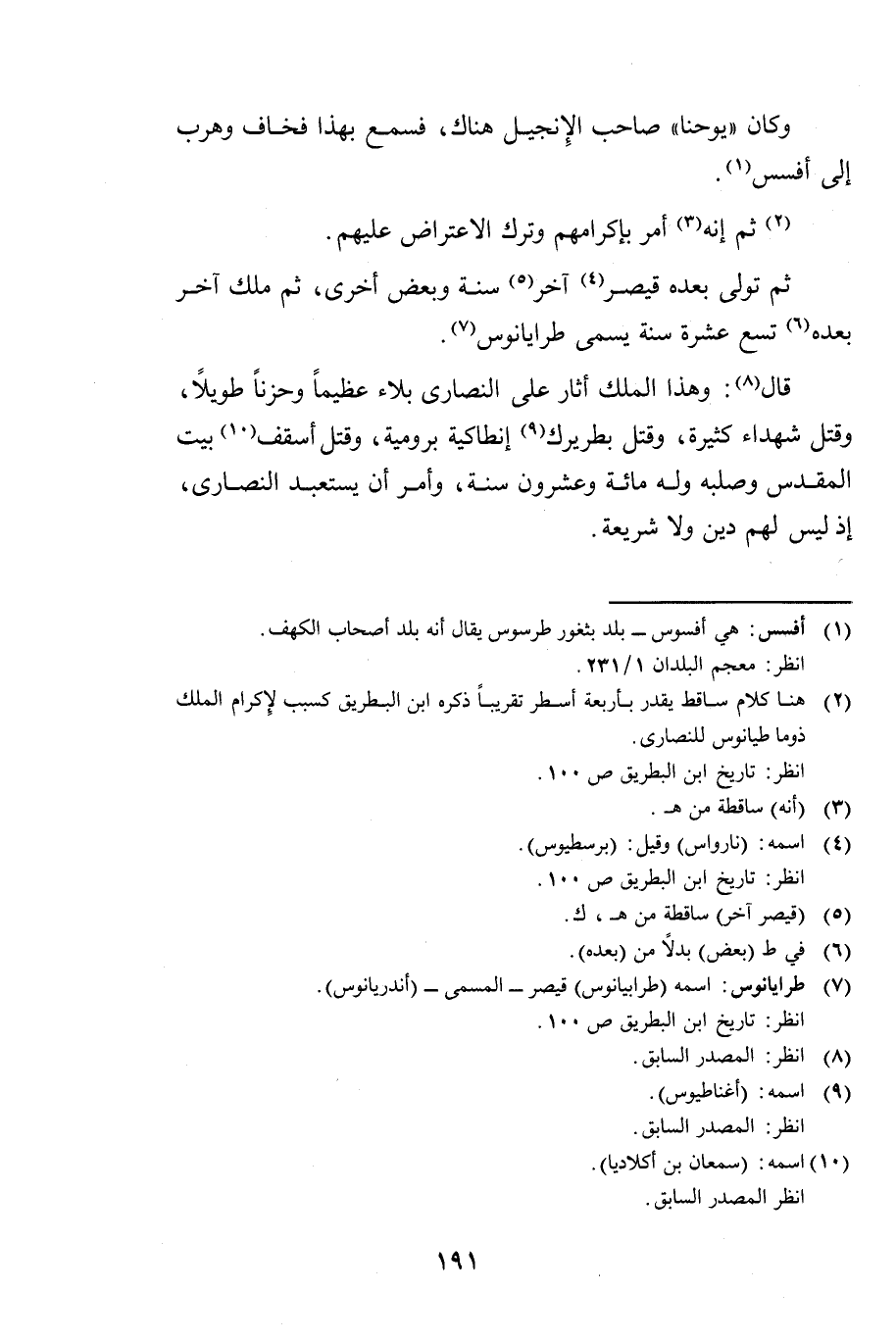 قَالَ: وَهَذَا الْمَلِكُ أَثَارَ عَلَى النَّصَارَى بَلَاءً عَظِيمًا وَحُزْنًا طَوِيلًا، وَقَتَلَ شُهَدَاءَ كَثِيرَةً، وَقَتَلَ بَطْرِيَرْكَ إِنْطَاكِيَةَ بِرُومِيَّةَ وَقَتَلَ أَسْقُفَّ بَيْتِ الْمَقْدِسِ وَصَلَبَهُ وَلَهُ مِائَةٌ وَعِشْرُونَ سَنَةً، وَأَمَرَ أَنْ يُسْتَعْبَدَ النَّصَارَى إِذْ لَيْسَ لَهُمْ دِينٌ وَلَا شَرِيعَةٌ.