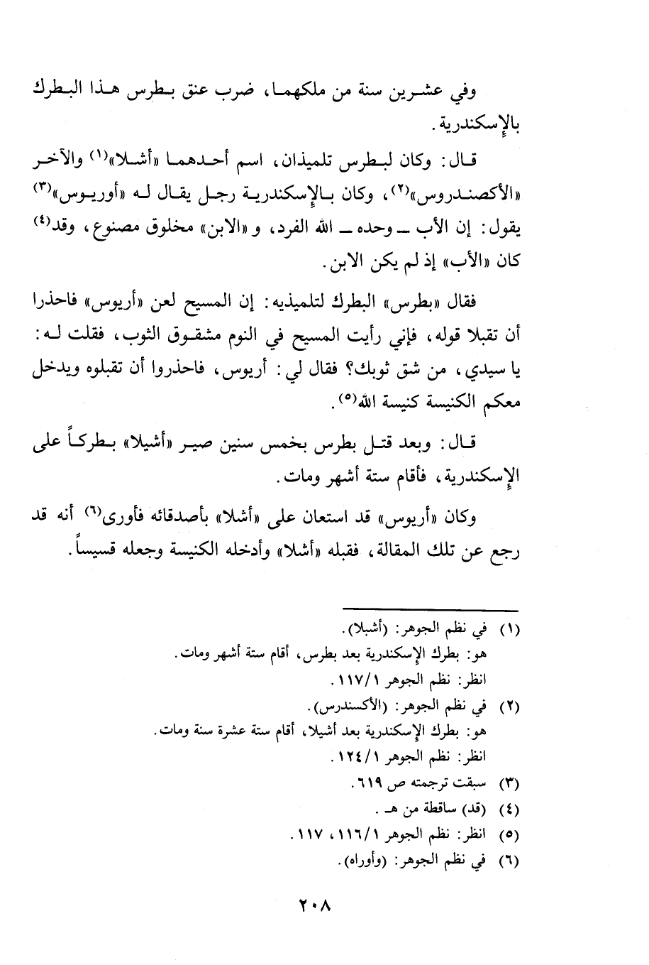 قَالَ: وَكَانَ لِبُطْرُسَ تِلْمِيذَانِ، اسْمُ أَحَدِهِمَا " أَشْلَا " وَالْآخُرِ " الْأَكْصَنْدَرُوسُ " وَكَانَ بِالْإِسْكَنْدَرِيَّةِ رَجُلٌ يُقَالُ لَهُ: " أُورْيُوسُ " يَقُولُ: إِنَّ الْأَبَ وَحْدَهُ اللَّهُ الْفَرْدُ، وَالِابْنُ مَخْلُوقٌ مَصْنُوعٌ، وَقَدْ كَانَ (الْأَبُ) إِذْ لَمْ يَكُنِ الِابْنُ.
