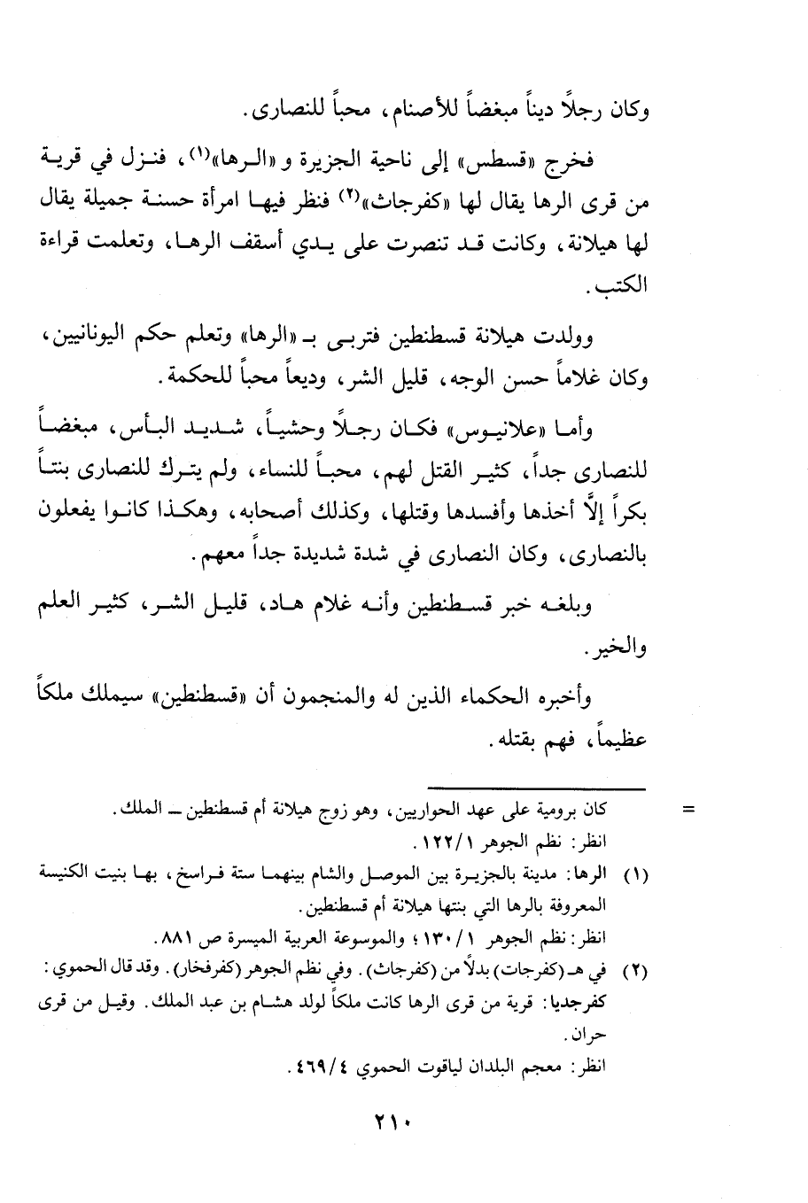 وَوَلَدَتْ " هِيلَانَةُ " " قُسْطَنْطِينَ " " فَتَرَبَّى بِـ " الرَّهَا " وَتَعَلَّمَ حِكَمَ الْيُونَانِيِّينَ، وَكَانَ غُلَامًا حَسَنَ الْوَجْهِ قَلِيلَ الشَّرِّ، وَدِيعًا مُحِبًّا لِلْحِكْمَةِ.