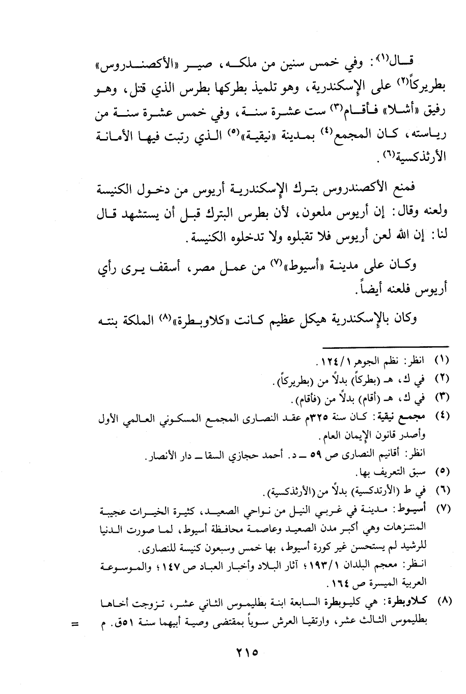 قَالَ: وَفِي خَمْسِ سِنِينَ مِنْ مُلْكِهِ صَيَّرَ " الْأَكْصَنْدُرُوسَ " بَطْرِيَرْكًا عَلَى الْإِسْكَنْدَرِيَّةِ، وَهُوَ تِلْمِيذُ بَطْرَكِهَا " بُطْرُسَ " الَّذِي قُتِلَ وَهُوَ رَفِيقُ " أَشْلَا "، فَأَقَامَ سِتَّ عَشْرَةَ سَنَةً، وَفِي خَمْسَ عَشْرَةَ سَنَةً مِنْ رِيَاسَتِهِ، كَانَ الْمَجْمَعُ بِمَدِينَةِ " نِيقِيَّةَ " الَّذِي رُتِّبَتْ فِيهِ الْأَمَانَةُ الْأَرْثُذُكْسِيَّةُ.