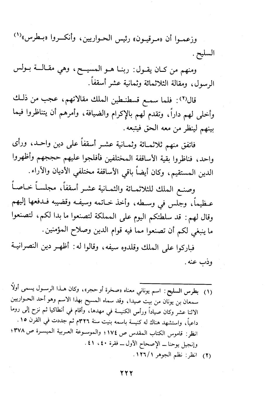 فَاتَّفَقَ مِنْهُمْ ثَلَاثُمِائَةٍ وَثَمَانِيَةَ عَشَرَ أُسْقُفًّا عَلَى دِينٍ وَاحِدٍ وَرَأْيٍ وَاحِدٍ، فَنَاظَرُوا بَقِيَّةَ الْأَسَاقِفَةِ الْمُخْتَلِفِينَ فَأَفْلَجُوا عَلَيْهِمْ حُجَجَهُمْ وَأَظْهَرُوا الدِّينَ الْمُسْتَقِيمَ، وَكَانَ أَيْضًا بَاقِي الْأَسَاقِفَةِ مُخْتَلِفِي الْأَدْيَانِ وَالْآرَاءِ.