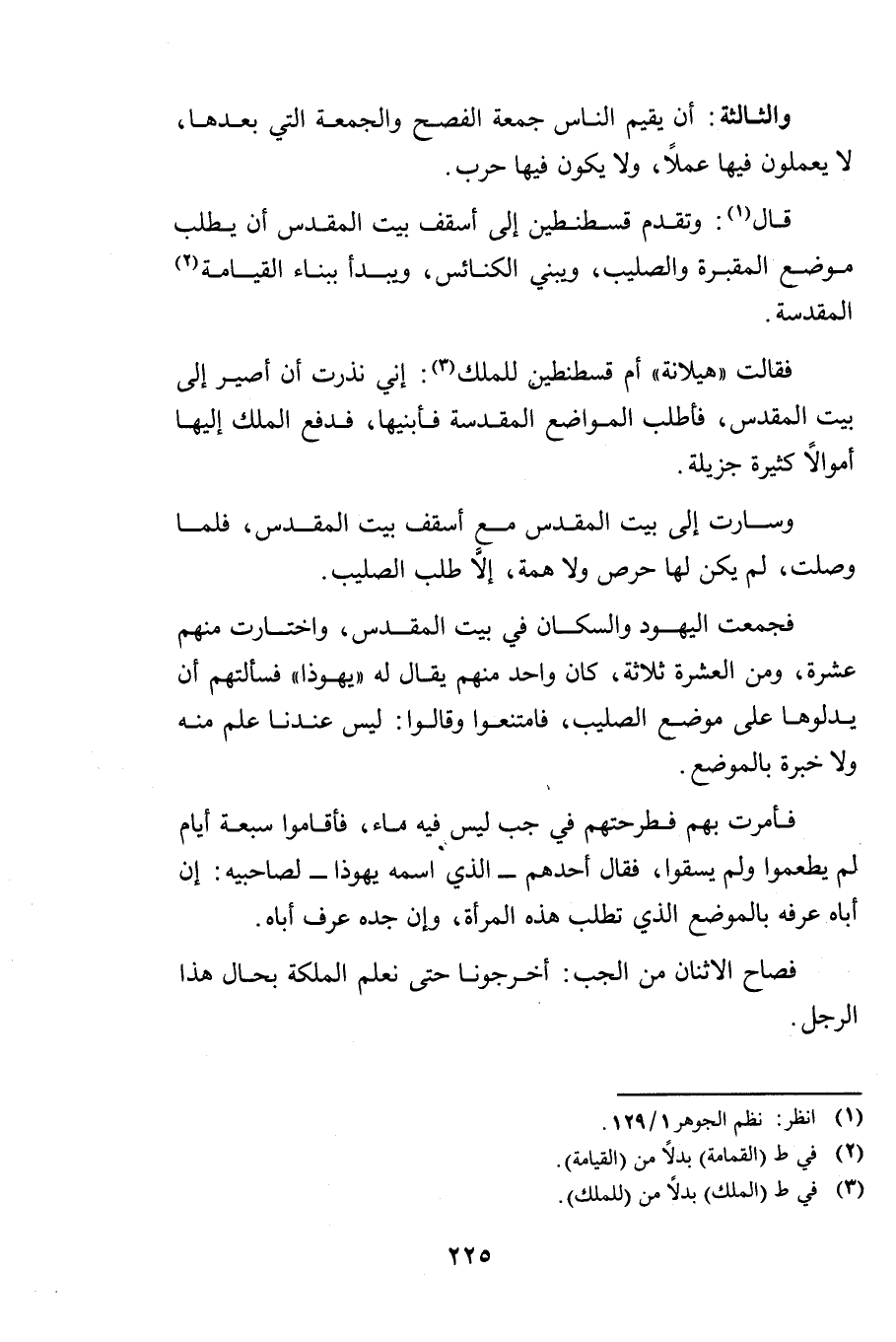 فَقَالَتْ " هِيلَانَةُ " أُمُّ " قُسْطَنْطِينَ " لِلْمَلِكِ: إِنِّي نَذَرْتُ أَنْ أَصِيرَ إِلَى بَيْتِ الْمَقْدِسِ فَأَطْلُبَ الْمَوَاضِعَ الْمُقَدَّسَةَ فَأَبْنِيَهَا، فَدَفَعَ الْمَلِكُ إِلَيْهَا أَمْوَالًا كَثِيرَةً جَزِيلَةً.