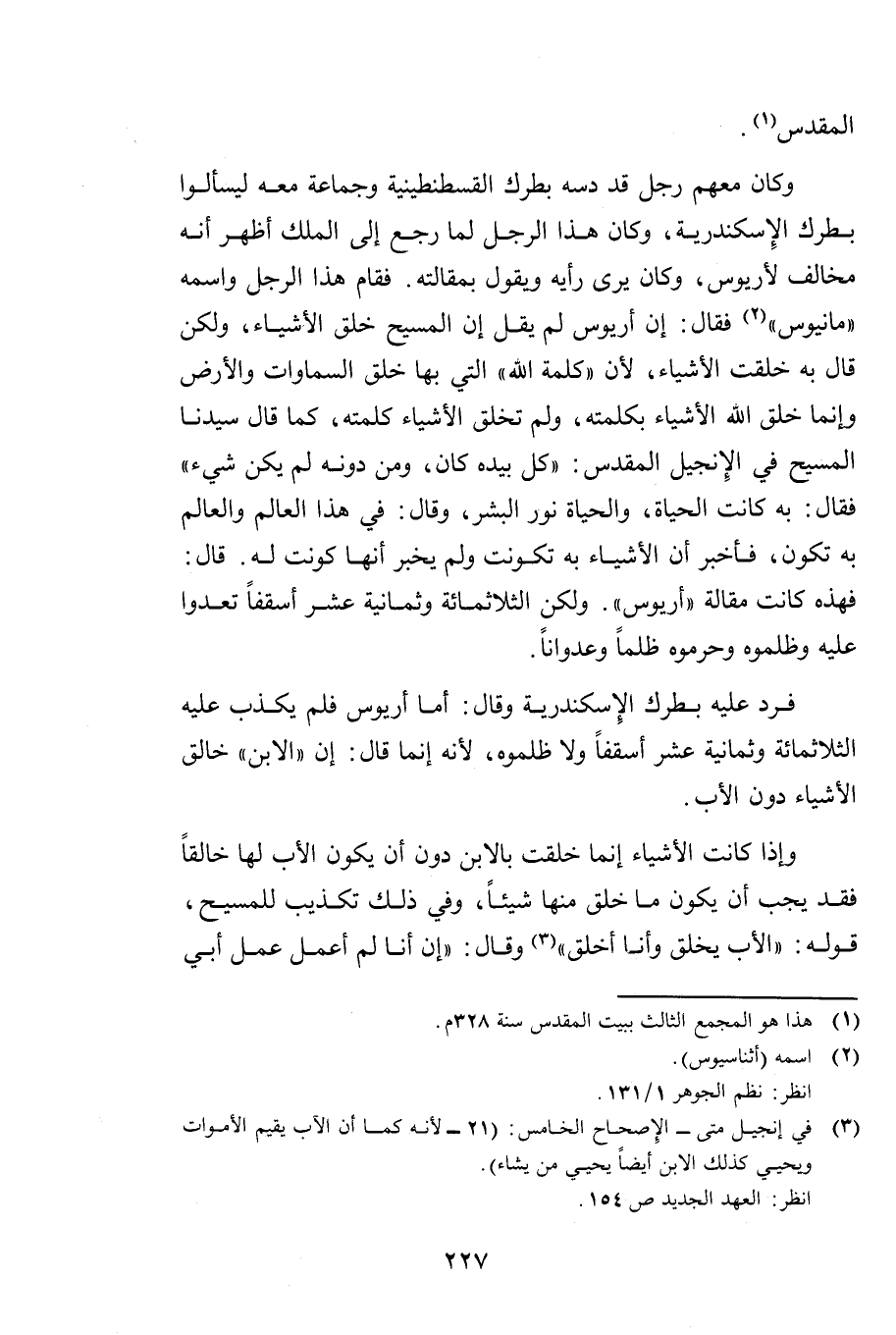 وَكَانَ مَعَهُمْ رَجُلٌ قَدْ دَسَّهُ بَطْرَكُ الْقُسْطَنْطِينِيَّةِ وَجَمَاعَةٌ مَعَهُ لِيَسْأَلُوا بَطْرَكَ الْإِسْكَنْدَرِيَّةِ، وَكَانَ هَذَا الرَّجُلُ لَمَّا رَجَعَ إِلَى الْمَلِكِ أَظْهَرَ أَنَّهُ مُخَالِفٌ لِأَرِيُوسَ، وَكَانَ يَرَى رَأْيَهُ وَيَقُولُ بِمَقَالَتِهِ، فَقَامَ هَذَا الرَّجُلُ وَاسْمُهُ " مَانْيُوسُ " فَقَالَ: إِنَّ " أَرِيوُسَ " لَمْ يَقُلْ إِنَّ الْمَسِيحَ خَلَقَ الْأَشْيَاءَ، وَلَكِنْ قَالَ بِهِ خُلِقَتِ الْأَشْيَاءُ، لِأَنَّهُ " كَلِمَةُ اللَّهِ " الَّتِي بِهَا خَلَقَ السَّمَاوَاتِ وَالْأَرْضَ، وَإِنَّمَا خَلَقَ اللَّهُ الْأَشْيَاءَ بِكَلِمَتِهِ، وَلَمْ تَخْلُقِ الْأَشْيَاءَ كَلِمَتُهُ، كَمَا قَالَ سَيِّدُنَا الْمَسِيحُ فِي الْإِنْجِيلِ الْمُقَدَّسِ: " كُلٌّ بِيَدِهِ كَانَ، وَمِنْ دُونِهِ لَمْ يَكُنْ شَيْءٌ ". فَقَالَ: بِهِ كَانَتِ الْحَيَاةُ، وَالْحَيَاةُ نُورُ الْبَشَرِ. وَقَالَ: فِي هَذَا الْعَالَمِ وَالْعَالَمُ بِهِ تَكَوَّنَ، فَأَخْبَرَ أَنَّ الْأَشْيَاءَ بِهِ تَكَوَّنَتْ وَلَمْ يُخْبِرْ أَنَّهَا كُوِّنَتْ لَهُ، قَالَ: فَهَذِهِ كَانَتْ مَقَالَةُ " أَرِيُوسَ " وَلَكِنَّ الثَّلَاثَمِائَةِ وَثَمَانِيَةَ عَشَرَ أُسْقُفًّا تَعَدَّوْا عَلَيْهِ وَظَلَمُوهُ وَحَرَّمُوهُ ظُلْمًا وَعُدْوَانًا.