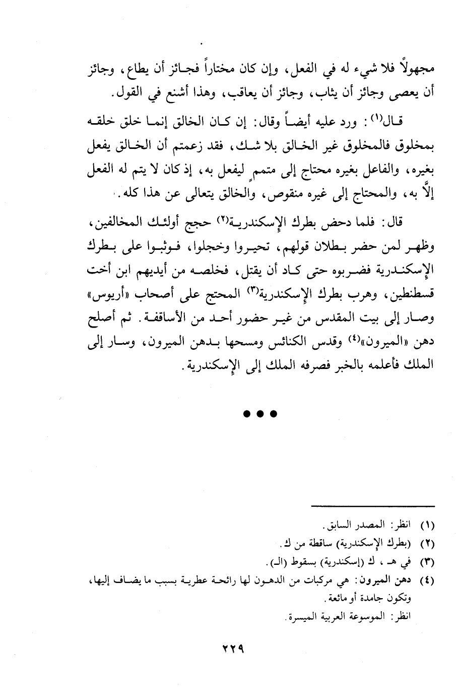 قَالَ: وَرَدَّ عَلَيْهِ أَيْضًا وَقَالَ: إِنْ كَانَ الْخَالِقُ إِنَّمَا خَلَقَ خَلْقَهُ بِمَخْلُوقٍ، فَالْمَخْلُوقُ غَيْرُ الْخَالِقِ بِلَا شَكٍّ، فَقَدْ زَعَمْتُمْ أَنَّ الْخَالِقَ يَفْعَلُ بِغَيْرِهِ، وَالْفَاعِلُ بِغَيْرِهِ مُحْتَاجٌ إِلَى مُتَمِّمٍ لِيَفْعَلَ بِهِ إِذْ كَانَ لَا يَتِمُّ لَهُ الْفِعْلُ إِلَّا بِهِ، وَالْمُحْتَاجُ إِلَى غَيْرِهِ مَنْقُوصٌ، وَالْخَالِقُ يَتَعَالَى عَنْ هَذَا كُلِّهِ.