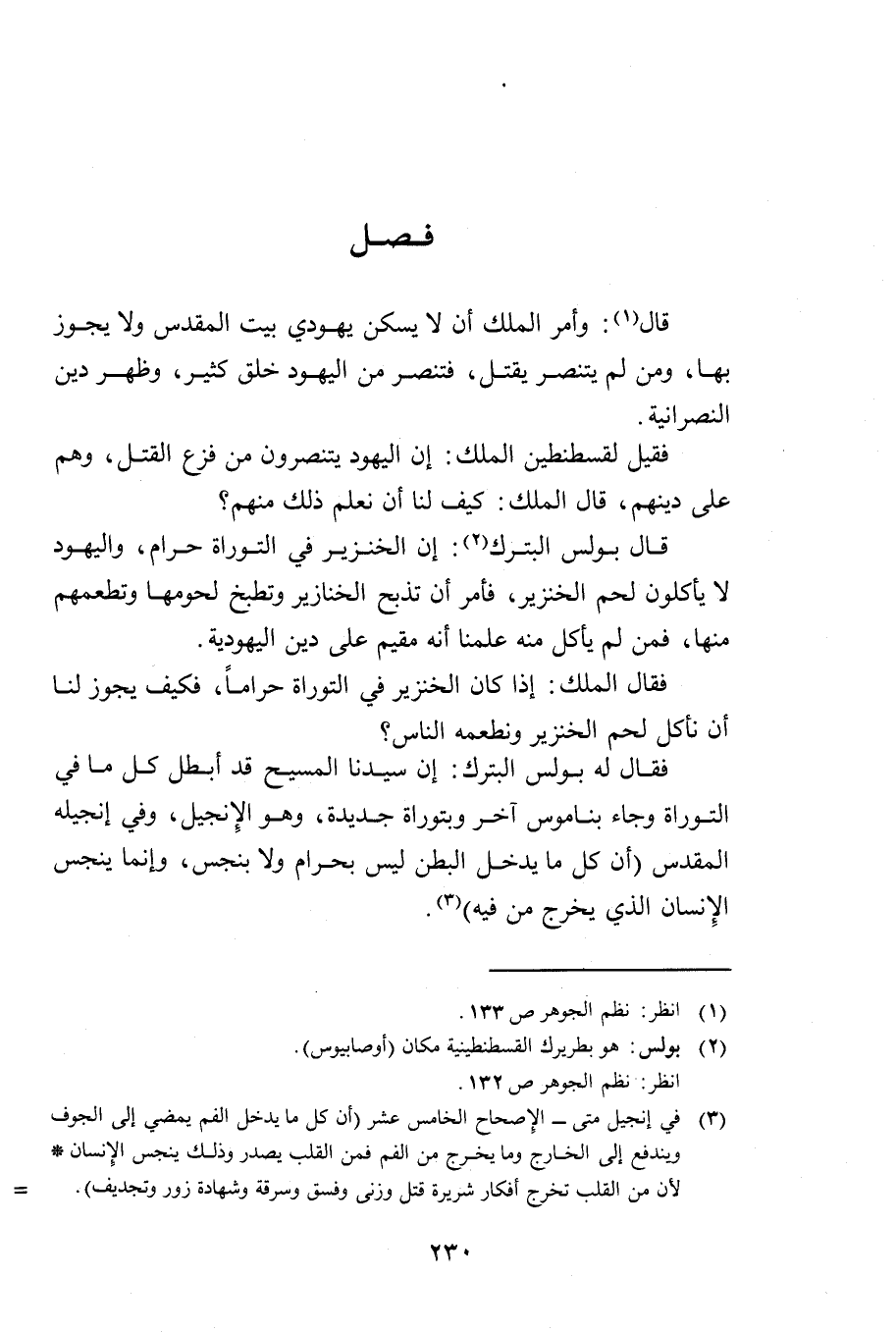 قَالَ بُولُسُ الْبَتْرَكُ: إِنَّ الْخِنْزِيرَ فِي التَّوْرَاةِ حَرَامٌ وَالْيَهُودُ لَا يَأْكُلُونَ لَحْمَ الْخِنْزِيرِ، فَأْمُرْ أَنْ تُذْبَحَ الْخَنَازِيرُ وَتُطْبَخَ لُحُومُهَا وَتُطْعِمَهُمْ مِنْهَا، فَمَنْ لَمْ يَأْكُلْ مِنْهُ عَلِمْنَا أَنَّهُ مُقِيمٌ عَلَى دِينِ الْيَهُودِيَّةِ.
