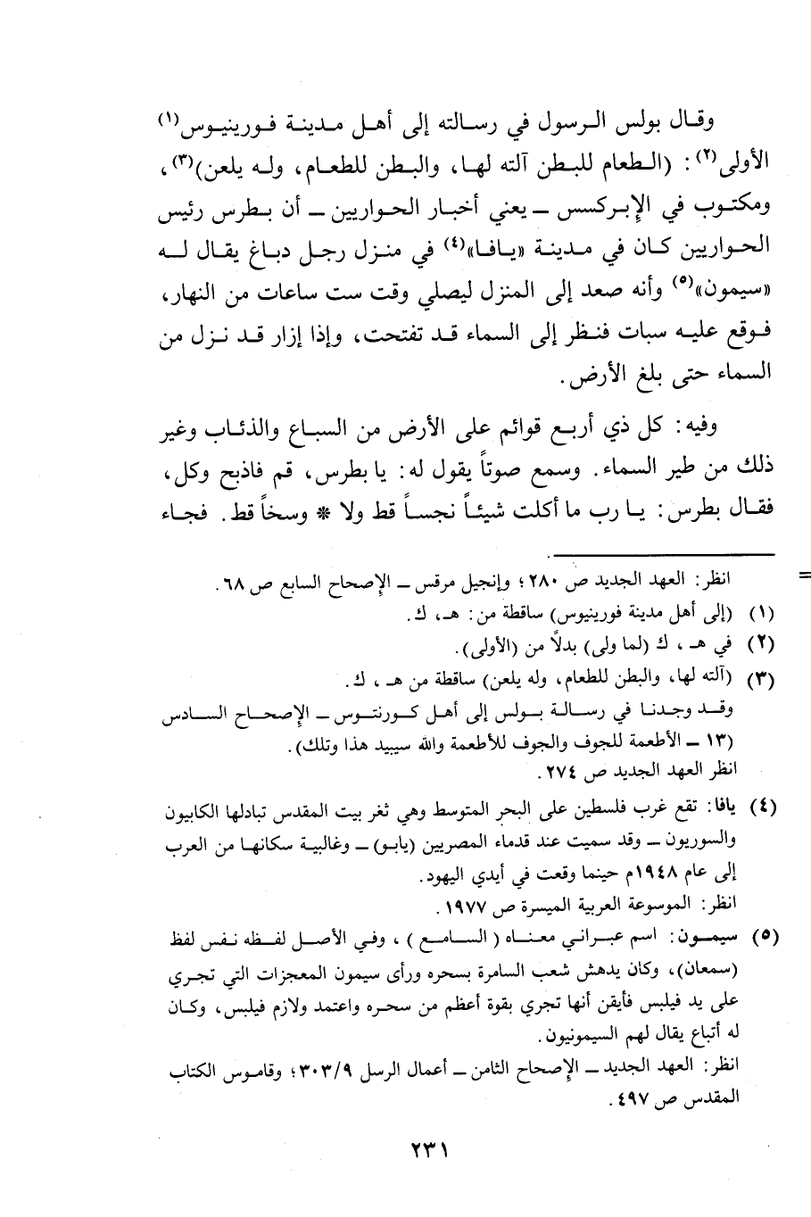 وَقَالَ بُولُسُ الرَّسُولُ فِي رِسَالَتِهِ إِلَى أَهْلِ مَدِينَةِ " فُورِينْيُوسَ " الْأُولَى: (الطَّعَامُ لِلْبَطْنِ آلَتُهُ لَهَا، وَالْبَطْنُ لِلطَّعَامِ، وَلَهُ يُلْعَنُ) . وَمَكْتُوبٌ فِي " الْإِبْرِكْسِسِ " يَعْنِي أَخْبَارَ الْحَوَارِيِّينَ: أَنَّ بُطْرُسَ رَئِيسَ الْحَوَارِيِّينَ كَانَ فِي مَدِينَةِ " يَافَا " فِي مَنْزِلِ رَجُلٍ دَبَّاغٍ يُقَالُ لَهُ: " سِيمُونُ "، وَأَنَّهُ صَعِدَ إِلَى الْمَنْزِلِ لِيُصَلِّيَ وَقْتَ سِتِّ سَاعَاتٍ مِنَ النَّهَارِ، فَوَقَعَ عَلَيْهِ سُبَاتٌ فَنَظَرَ إِلَى السَّمَاءِ قَدْ تَفَتَّحَتْ وَإِذَا إِزَارٌ قَدْ نَزَلَ مِنَ السَّمَاءِ حَتَّى بَلَغَ الْأَرْضَ.