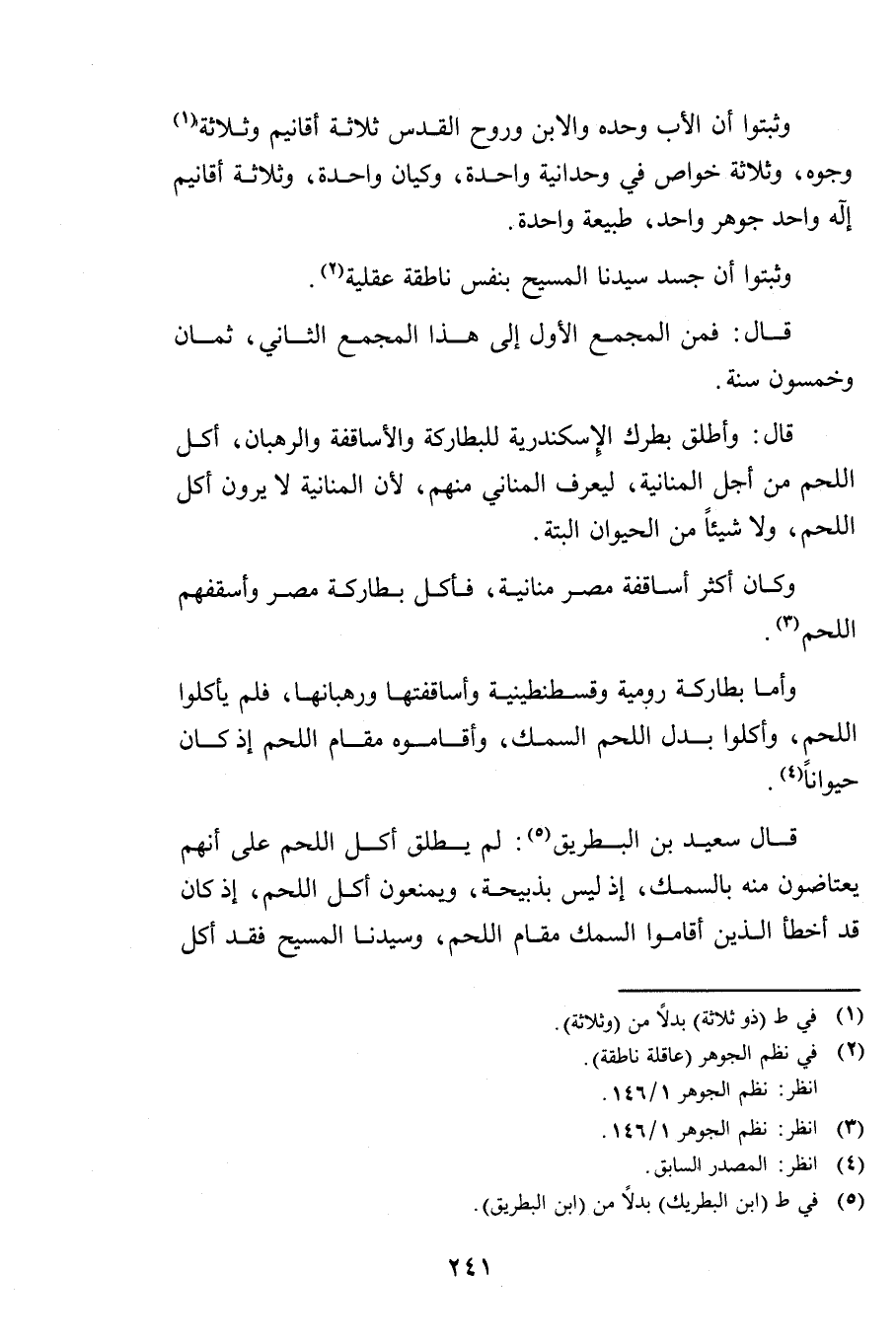 وَكَانَ أَكْثَرُ أَسَاقِفَةِ مِصْرَ مَنَانِيَّةً، فَأَكَلَ بَطَارِكَةُ مِصْرَ وَأُسْقُفُّهُمُ اللَّحْمَ.
