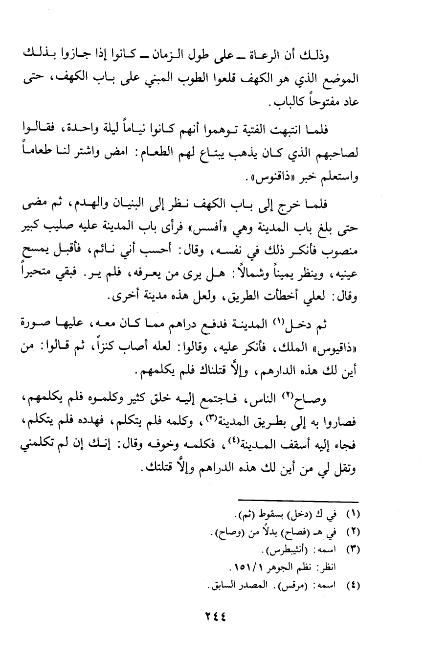 ثُمَّ دَخَلَ الْمَدِينَةَ فَدَفَعَ دَرَاهِمَ مِمَّا كَانَ مَعَهُ عَلَيْهَا صُورَةُ " ذَاقْيُوسَ " الْمَلِكِ فَأُنْكِرَ عَلَيْهِ، وَقَالُوا: لَعَلَّهُ أَصَابَ كَنْزًا، ثُمَّ قَالُوا: مِنْ أَيْنَ لَكَ هَذِهِ الدَّرَاهِمُ وَإِلَّا قَتَلْنَاكَ، فَلَمْ يُكَلِّمْهُمْ.