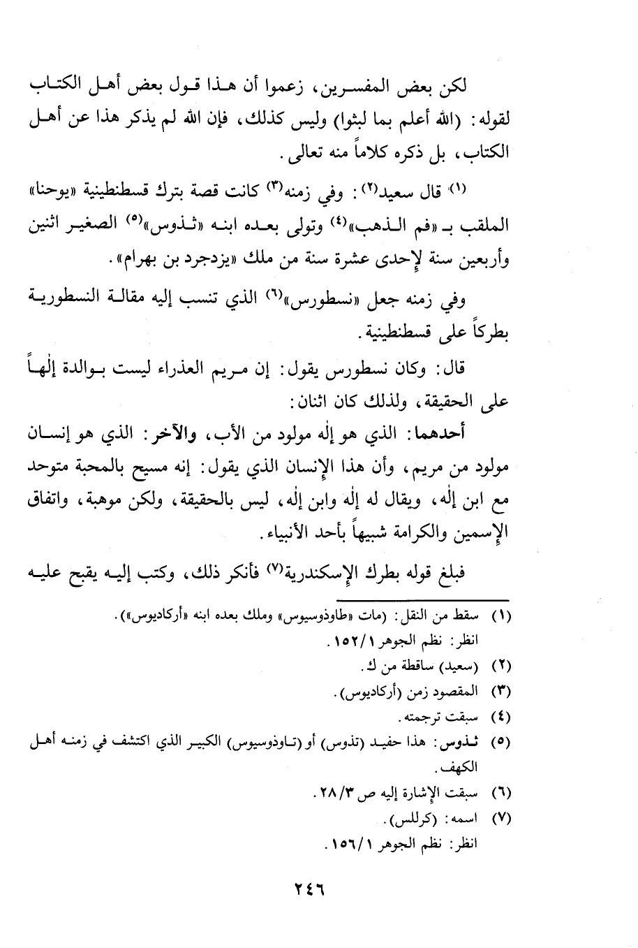 قَالَ: وَكَانَ " نَسْطُورِسُ " يَقُولُ: إِنَّ مَرْيَمَ الْعَذْرَاءَ لَيْسَتْ بِوَالِدَةٍ إِلَهًا عَلَى الْحَقِيقَةِ، وَلِذَلِكَ كَانَ اثْنَانِ.