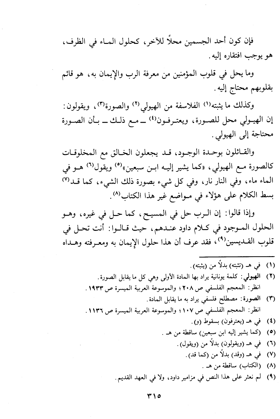 وَإِذَا قَالُوا: إِنَّ الرَّبَّ حَلَّ فِي الْمَسِيحِ كَمَا حَلَّ فِي غَيْرِهِ، وَهُوَ الْحُلُولُ الْمَوْجُودُ فِي كَلَامِ دَاوُدَ عِنْدَهُمْ، حَيْثُ قَالُوا: أَنْتَ تَحُلُّ فِي قُلُوبِ الْقِدِّيسِينَ، فَقَدْ عُرِفَ أَنَّ هَذَا حُلُولُ الْإِيمَانِ بِهِ وَمَعْرِفَتُهُ وَهُدَاهُ
