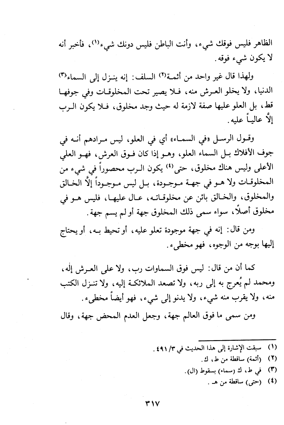 كَمَا أَنَّ مَنْ قَالَ: لَيْسَ فَوْقَ السَّمَاوَاتِ رَبٌّ، وَلَا عَلَى الْعَرْشِ إِلَهٌ، وَمُحَمَّدٌ لَمْ يُعْرَجْ بِهِ إِلَى رَبِّهِ، وَلَا تَصْعَدُ الْمَلَائِكَةُ إِلَيْهِ، وَلَا تَنْزِلُ الْكُتُبُ مِنْهُ، وَلَا يَقْرُبُ مِنْهُ شَيْءٌ، وَلَا يَدْنُو إِلَى شَيْءٍ - فَهُوَ أَيْضًا مُخْطِئٌ.