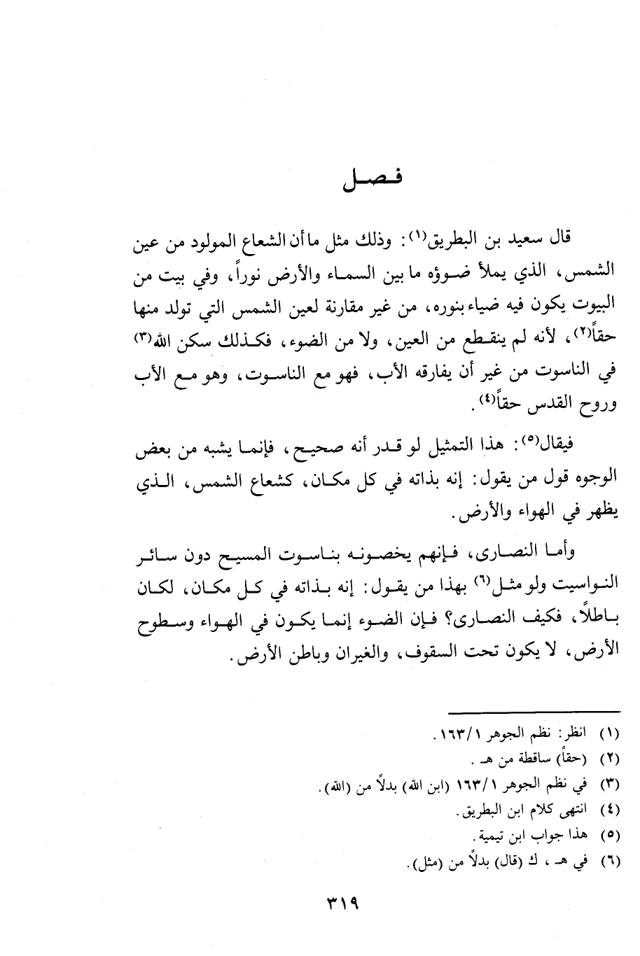 وَأَمَّا النَّصَارَى فَإِنَّهُمْ يَخُصُّونَهُ بِنَاسُوتِ الْمَسِيحِ دُونَ سَائِرِ النَّوَاسِيتِ، وَلَوْ مَثَّلَ بِهَذَا مَنْ يَقُولُ: إِنَّهُ بِذَاتِهِ فِي كُلِّ مَكَانٍ - لَكَانَ بَاطِلًا، فَكَيْفَ النَّصَارَى؟ فَإِنَّ الضَّوْءَ إِنَّمَا يَكُونُ فِي الْهَوَاءِ وَسُطُوحِ الْأَرْضِ، لَا يَكُونُ تَحْتَ السُّقُوفِ وَالْغِيرَانِ وَبَاطِنِ الْأَرْضِ.