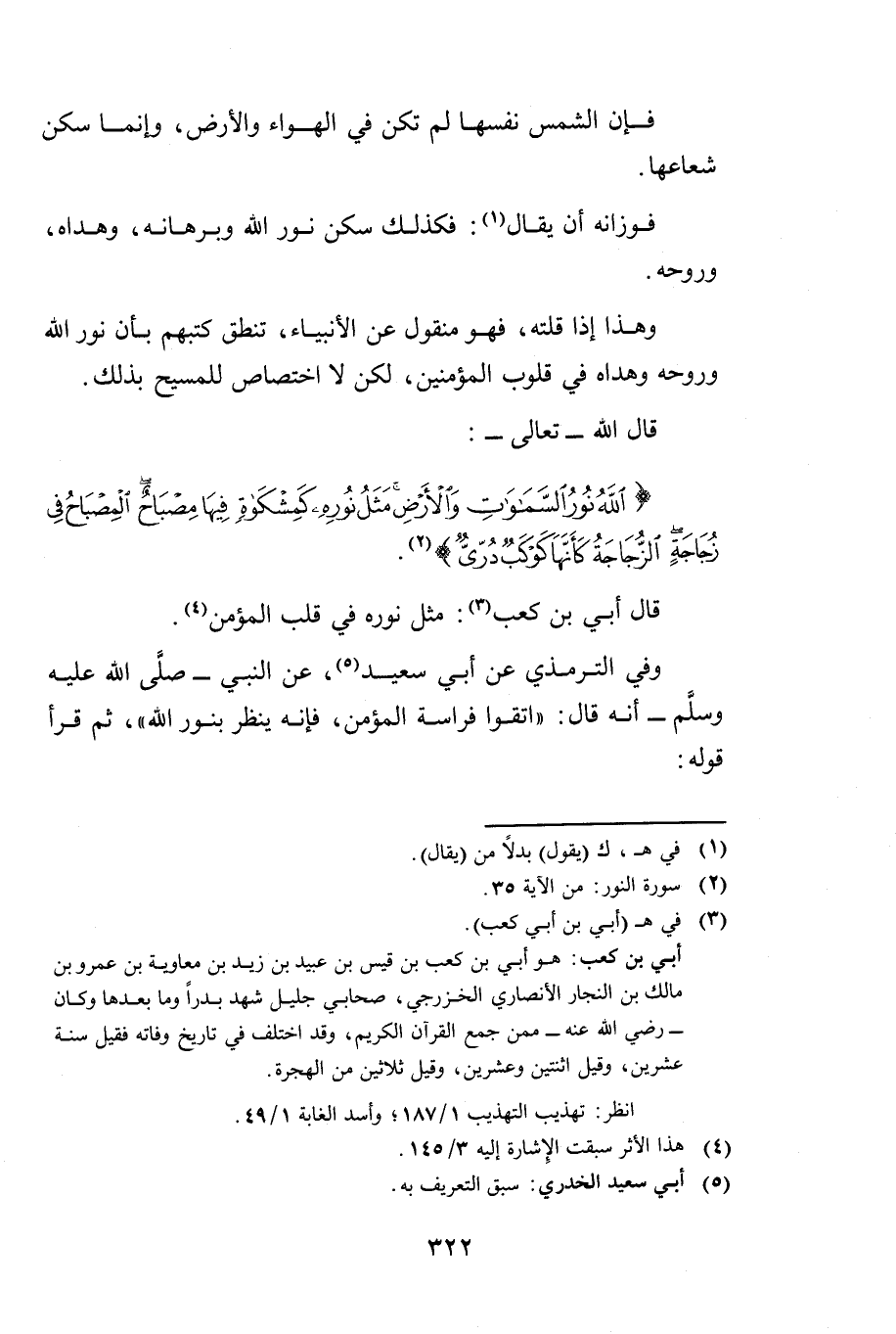 قَالَ أُبَيُّ بْنُ كَعْبٍ: مَثَلُ نُورِهِ فِي قَلْبِ الْمُؤْمِنِ.