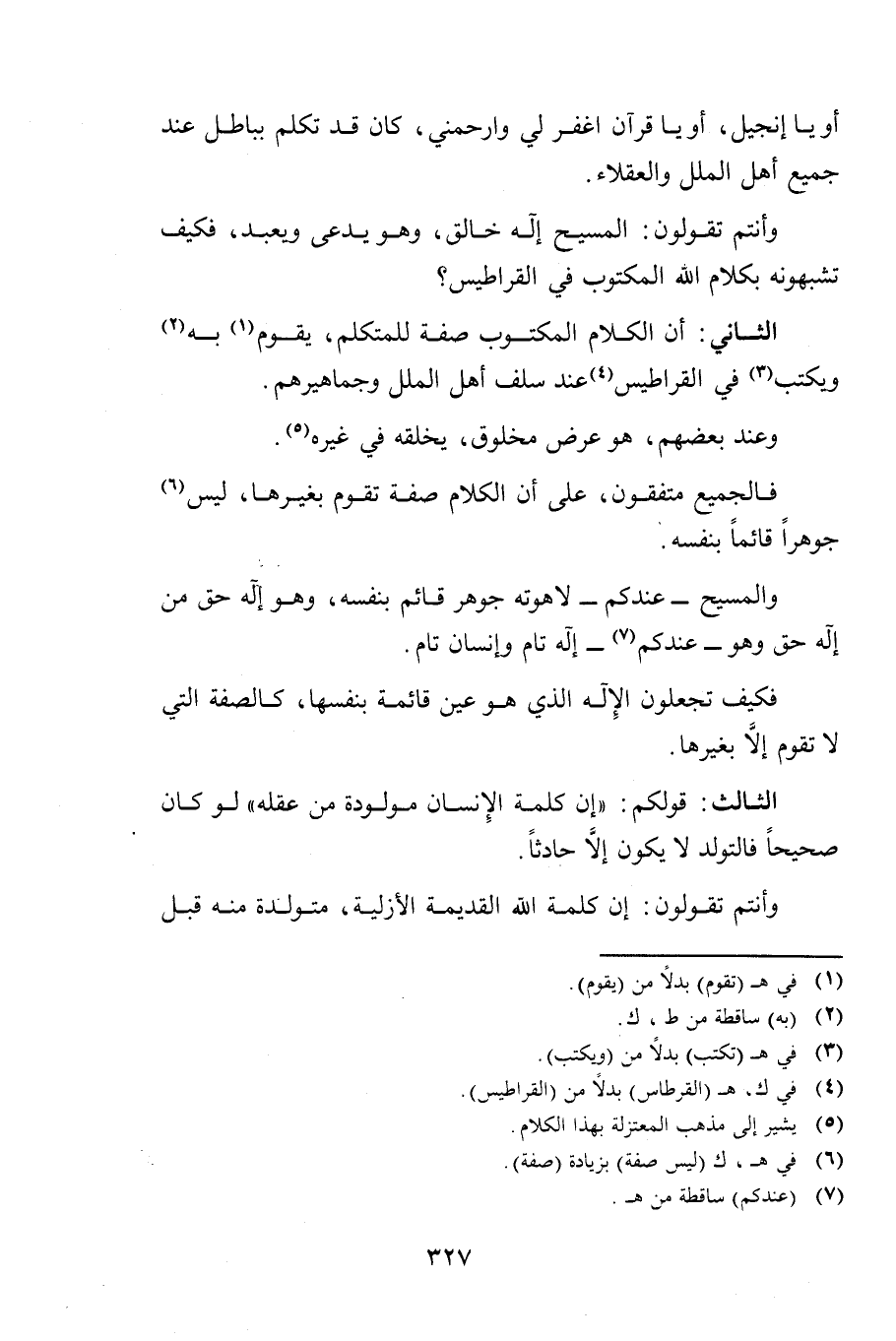 وَأَنْتُمْ تَقُولُونَ: الْمَسِيحُ إِلَهٌ خَالِقٌ، وَهُوَ يُدْعَى وَيُعْبَدُ، فَكَيْفَ تُشَبِّهُونَهُ بِكَلَامِ اللَّهِ الْمَكْتُوبِ فِي الْقَرَاطِيسِ؟
