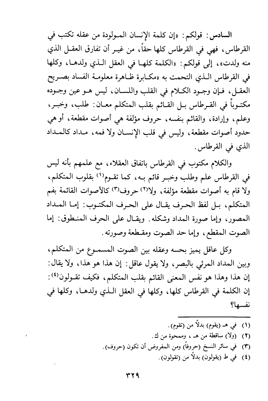 السَّادِسُ: قَوْلُكُمْ: (إِنَّ كَلِمَةَ الْإِنْسَانِ الْمَوْلُودَةَ مِنْ عَقْلِهِ تُكْتَبُ فِي الْقِرْطَاسِ، فَهِيَ فِي الْقِرْطَاسِ كُلُّهَا حَقًّا، مِنْ غَيْرِ أَنْ تُفَارِقَ الْعَقْلَ الَّذِي مِنْهُ وُلِدَتْ) ، إِلَى قَوْلِكُمْ: (الْكَلِمَةُ كُلُّهَا فِي الْعَقْلِ الَّذِي وَلَدَهَا، وَكُلُّهَا فِي الْقِرْطَاسِ الَّذِي الْتَحَمَتْ بِهِ) - مُكَابَرَةٌ ظَاهِرَةٌ، مَعْلُومَةُ الْفَسَادِ بِصَرِيحِ الْعَقْلِ، فَإِنَّ وُجُودَ الْكَلَامِ فِي الْقَلْبِ وَاللِّسَانِ، لَيْسَ هُوَ عَيْنُ وُجُودِهِ مَكْتُوبًا فِي الْقِرْطَاسِ، بَلِ الْقَائِمُ بِقَلْبِ الْمُتَكَلِّمِ مَعَانٍ: طَلَبٌ وَخَبَرٌ وَعِلْمٌ وَإِرَادَةٌ، وَالْقَائِمُ بِنَفْسِهِ حُرُوفٌ مُؤَلَّفَةٌ هِيَ أَصْوَاتٌ مُقَطَّعَةٌ، أَوْ هِيَ حُدُودُ أَصْوَاتٍ مُقَطَّعَةٍ، وَلَيْسَ فِي قَلْبِ الْإِنْسَانِ وَلَا فَمِهِ مِدَادٌ كَالْمِدَادِ الَّذِي فِي الْقِرْطَاسِ.