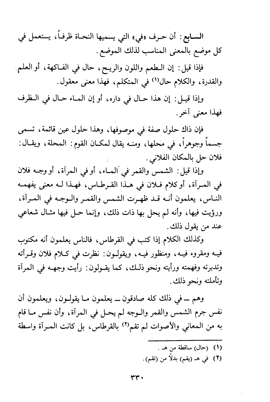 وَإِذَا قِيلَ: الشَّمْسُ وَالْقَمَرُ فِي الْمَاءِ، أَوْ فِي الْمِرْآةِ، أَوْ وَجْهُ فُلَانٍ فِي الْمِرْآةِ، أَوْ كَلَامُ فُلَانٍ فِي هَذَا الْقِرْطَاسِ، فَهَذَا لَهُ مَعْنًى يَفْهَمُهُ النَّاسُ، يَعْلَمُونَ أَنَّهُ قَدْ ظَهَرَتِ الشَّمْسُ وَالْقَمَرُ وَالْوَجْهُ فِي الْمِرْآةِ وَرُؤِيَتْ فِيهَا، وَأَنَّهُ لَمْ يَحُلَّ بِهَا ذَاتُ ذَلِكَ، وَإِنَّمَا حَلَّ فِيهَا مِثَالٌ شُعَاعِيٌّ عِنْدَ مَنْ يَقُولُ ذَلِكَ.