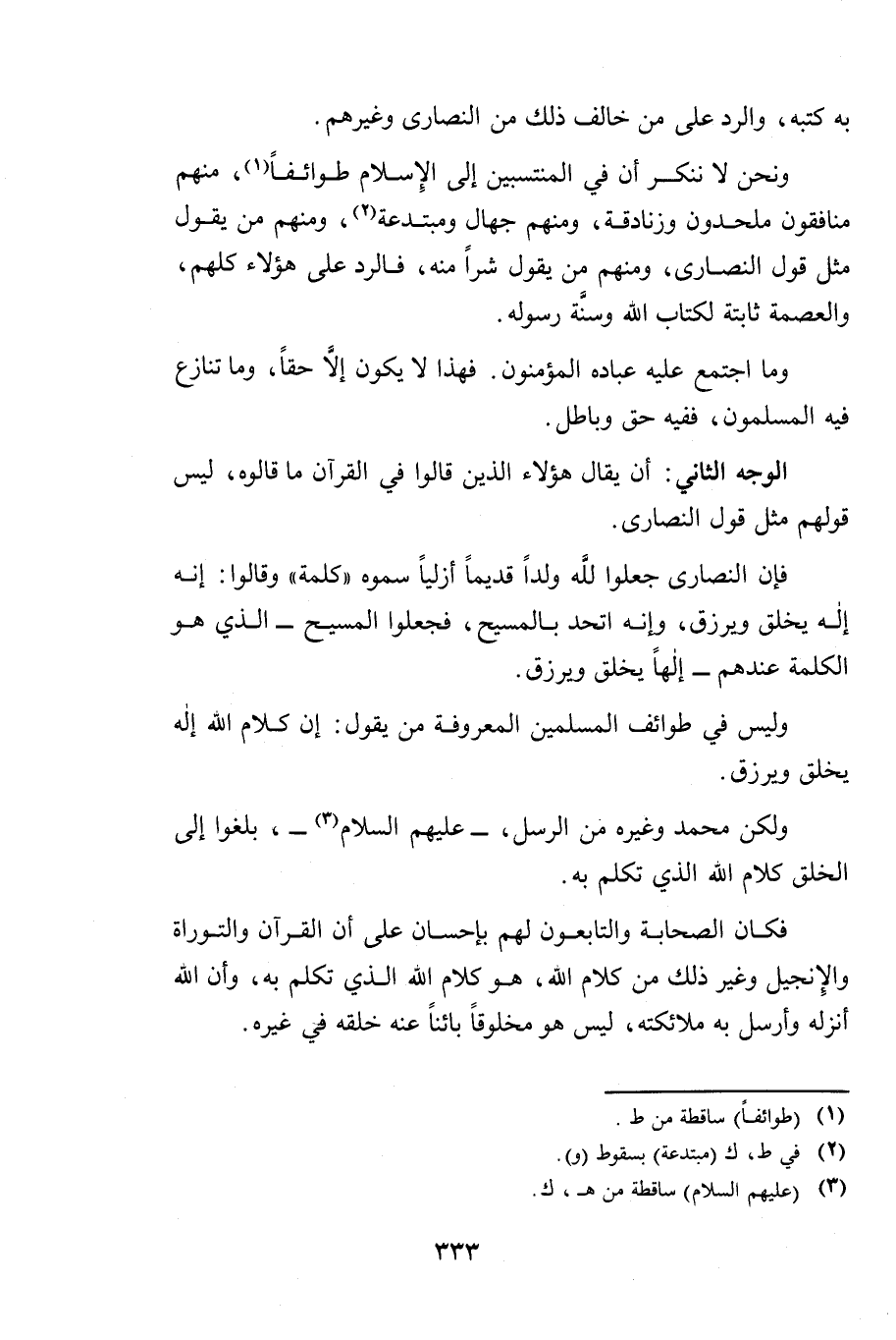 فَإِنَّ النَّصَارَى جَعَلُوا لِلَّهِ وَلَدًا قَدِيمًا أَزَلِيًّا سَمَّوْهُ كَلِمَةً، وَقَالُوا: إِنَّهُ إِلَهٌ يَخْلُقُ وَيَرْزُقُ، وَإِنَّهُ اتَّحَدَ بِالْمَسِيحِ، فَجَعَلُوا الْمَسِيحَ - الَّذِي هُوَ الْكَلِمَةُ عِنْدَهُمْ - إِلَهًا يَخْلُقُ وَيَرْزُقُ.