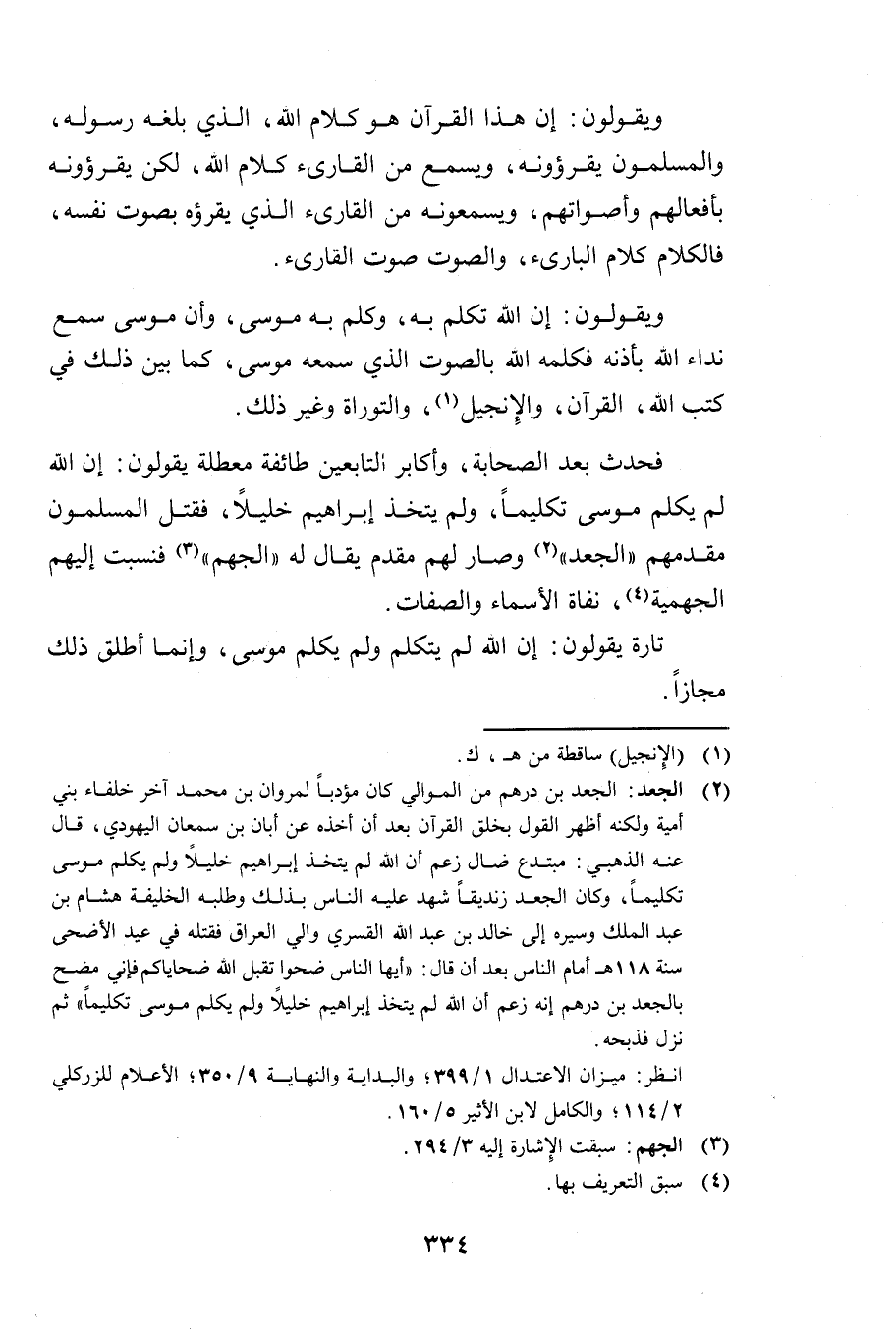 فَحَدَثَ بَعْدَ الصَّحَابَةِ وَأَكَابِرِ التَّابِعِينَ طَائِفَةٌ مُعَطِّلَةٌ يَقُولُونَ: إِنَّ اللَّهَ لَمْ يُكَلِّمْ مُوسَى تَكْلِيمًا، وَلَمْ يَتَّخِذْ إِبْرَاهِيمَ خَلِيلًا، فَقَتَلَ الْمُسْلِمُونَ مُقَدَّمَهُمْ " الْجَعْدَ " وَصَارَ لَهُمْ مُقَدَّمٌ يُقَالُ لَهُ " الْجَهْمُ " فَنُسِبَتْ إِلَيْهِمُ الْجَهْمِيَّةُ، نُفَاةُ الْأَسْمَاءِ وَالصِّفَاتِ.