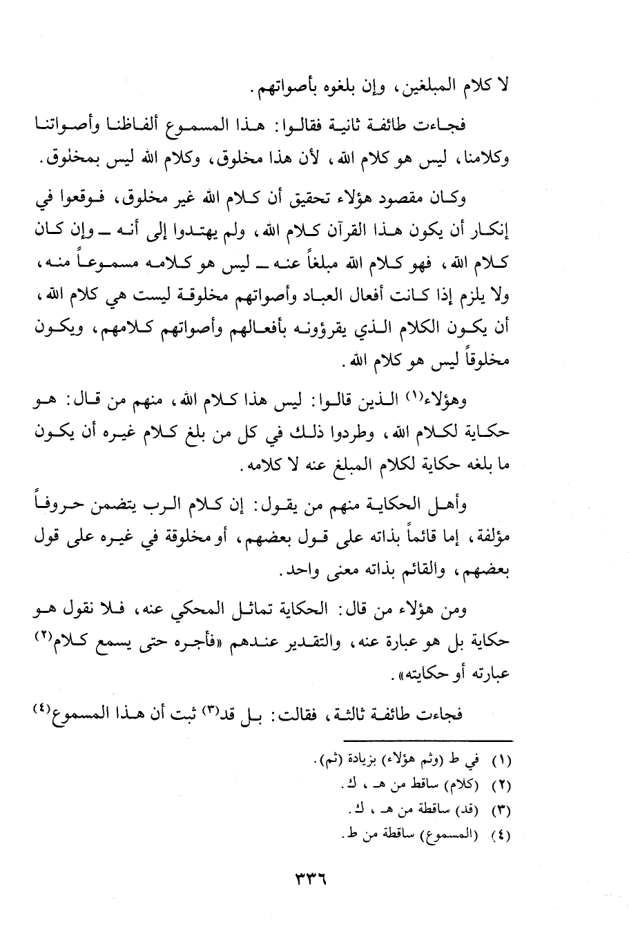 وَأَهْلُ الْحِكَايَةِ مِنْهُمْ مَنْ يَقُولُ: إِنَّ كَلَامَ الرَّبِّ يَتَضَمَّنُ حُرُوفًا مُؤَلَّفَةً، إِمَّا قَائِمًا بِذَاتِهِ عَلَى قَوْلِ بَعْضِهِمْ، أَوْ مَخْلُوقَةً فِي غَيْرِهِ عَلَى قَوْلِ بَعْضِهِمْ، وَالْقَائِمُ بِذَاتِهِ مَعْنًى وَاحِدٌ.