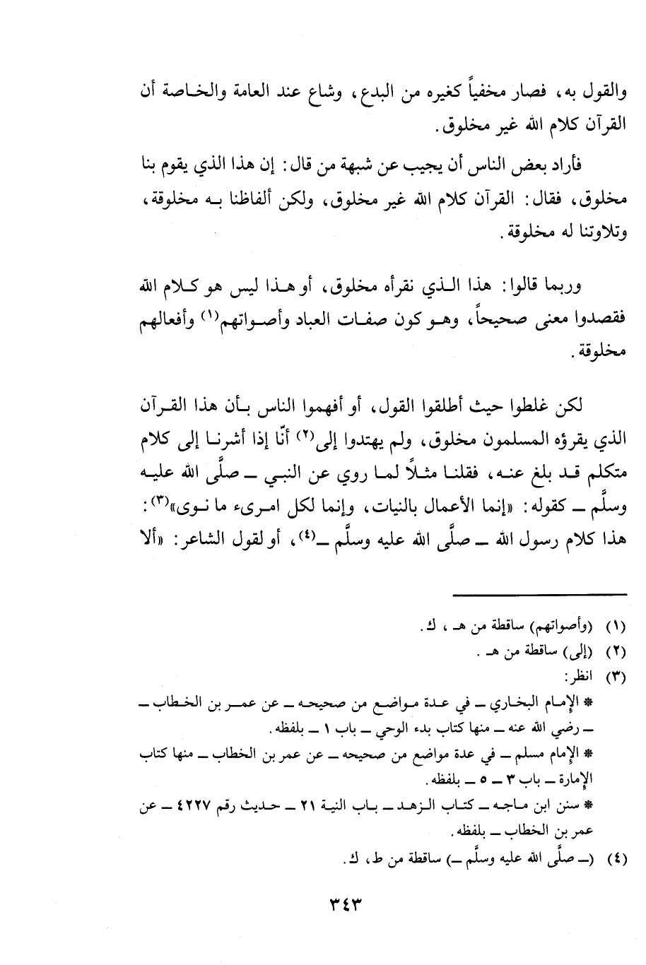 لَكِنْ غَلِطُوا حَيْثُ أَطْلَقُوا الْقَوْلَ، أَوْ أَفْهَمُوا النَّاسَ بِأَنَّ هَذَا الْقُرْآنَ الَّذِي يَقْرَؤُهُ الْمُسْلِمُونَ مَخْلُوقٌ، وَلَمْ يَهْتَدُوا إِلَى أَنَّا إِذَا أَشَرْنَا إِلَى كَلَامِ مُتَكَلِّمٍ قَدْ بُلِّغَ عَنْهُ، فَقُلْنَا مَثَلًا لِمَا رُوِيَ عَنِ النَّبِيِّ - صَلَّى اللَّهُ عَلَيْهِ وَسَلَّمَ - كَقَوْلِهِ: ( «إِنَّمَا الْأَعْمَالُ بِالنِّيَّاتِ، وَإِنَّمَا لِكُلِّ امْرِئٍ مَا نَوَى» ) : هَذَا كَلَامُ رَسُولِ اللَّهِ - صَلَّى اللَّهُ عَلَيْهِ وَسَلَّمَ -، أَوْ لِقَوْلِ الشَّاعِرِ: