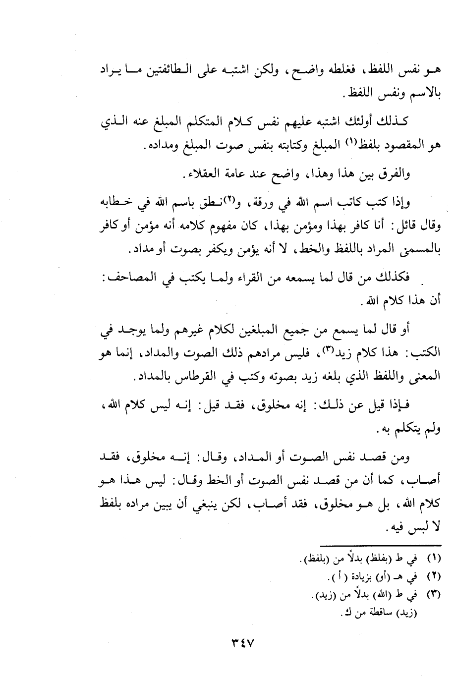 أَوْ قَالَ لِمَا يَسْمَعُ مِنْ جَمِيعِ الْمُبَلِّغِينَ لِكَلَامِ غَيْرِهِمْ، وَلِمَا يُوجَدُ فِي الْكُتُبِ: هَذَا كَلَامُ زَيْدٍ، فَلَيْسَ مُرَادُهُمْ ذَلِكَ الصَّوْتَ وَالْمِدَادَ، إِنَّمَا هُوَ الْمَعْنَى وَاللَّفْظُ الَّذِي بَلَّغَهُ زَيْدٌ بِصَوْتِهِ وَكُتِبَ فِي الْقِرْطَاسِ بِالْمِدَادِ.