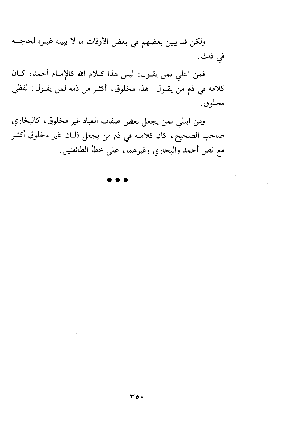 وَمَنِ ابْتُلِيَ بِمَنْ يَجْعَلُ بَعْضَ صِفَاتِ الْعِبَادِ غَيْرَ مَخْلُوقٍ، كَالْبُخَارِيِّ صَاحِبِ الصَّحِيحِ، كَانَ كَلَامُهُ فِي ذَمِّ مَنْ يَجْعَلُ ذَلِكَ غَيْرَ مَخْلُوقٍ، أَكْثَرَ، مَعَ نَصِّ أَحْمَدَ وَالْبُخَارِيِّ وَغَيْرِهِمَا، عَلَى خَطَأِ الطَّائِفَتَيْنِ.