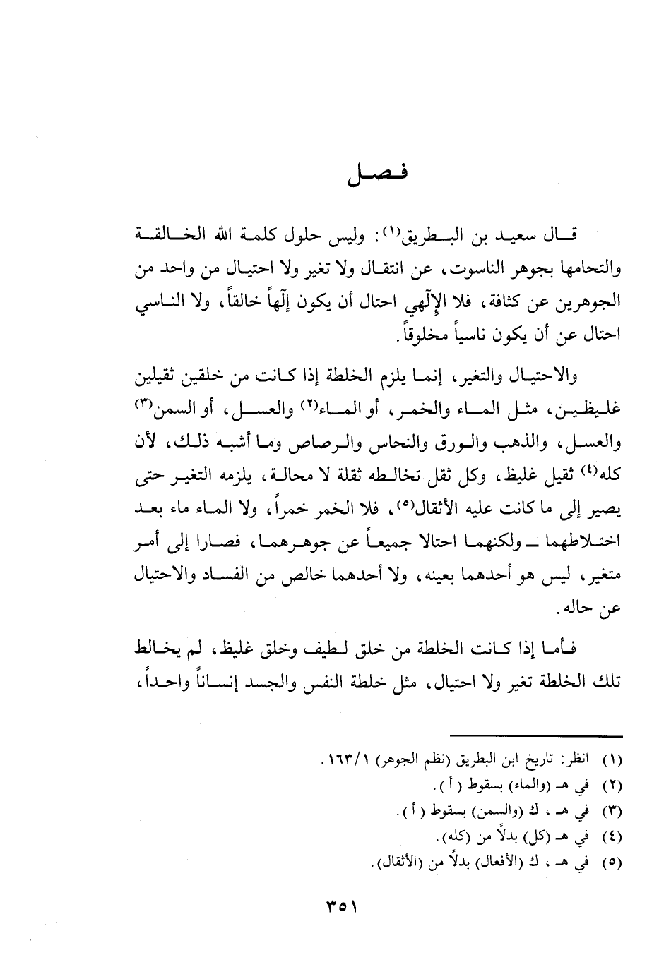 قَالَ سَعِيدُ بْنُ الْبِطْرِيقِ: وَلَيْسَ حُلُولُ كَلِمَةِ اللَّهِ الْخَالِقَةِ وَالْتِحَامُهَا بِجَوْهَرِ النَّاسُوتِ - عَنِ انْتِقَالٍ وَلَا تَغَيُّرٍ وَلَا احْتِيَالٍ مِنْ وَاحِدٍ مِنَ الَجْوَهَرَيْنِ عَنْ كَثَافَةٍ، فَلَا الْإِلَهِيُّ احْتَالَ أَنْ يَكُونَ إِلَهًا خَالِقًا، وَلَا النَّاسِيُّ احْتَالَ عَنْ أَنْ يَكُونَ نَاسِيًّا مَخْلُوقًا.