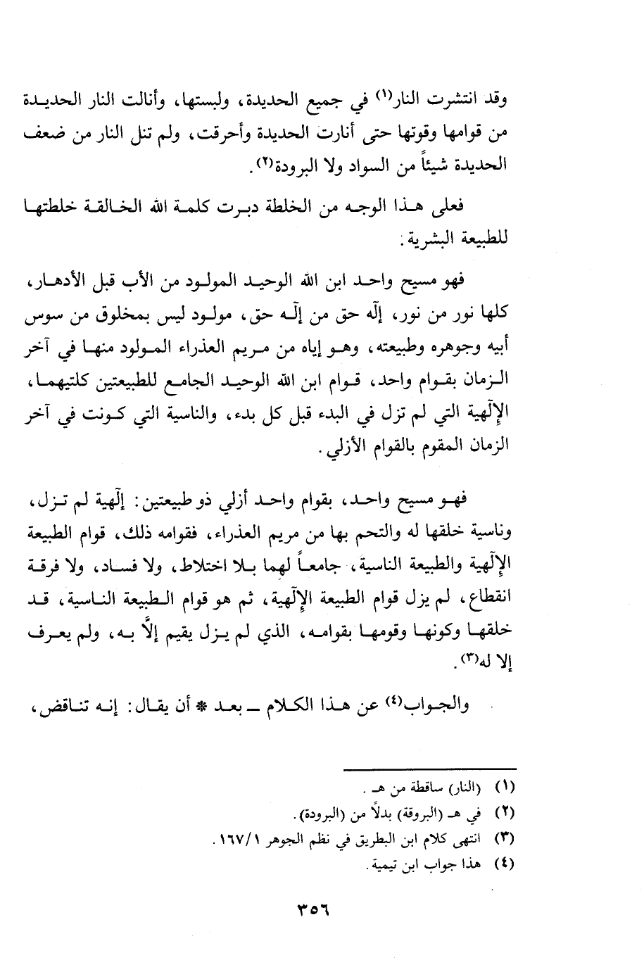 فَهُوَ مَسِيحٌ وَاحِدٌ بِقِوَامٍ وَاحِدٍ أَزَلِيٍّ، ذُو طَبِيعَتَيْنِ إِلَهِيَّةٍ لَمْ تَزَلْ، وَنَاسِيَّةٍ خَلَقَهَا لَهُ وَالْتَحَمَ بِهَا مِنْ مَرْيَمَ الْعَذْرَاءِ، فَقِوَامُهُ ذَلِكَ قِوَامُ الطَّبِيعَةِ الْإِلَهِيَّةِ وَالطَّبِيعَةِ النَّاسِيَّةِ، جَامِعًا لَهُمَا بِلَا اخْتِلَاطٍ وَلَا فَسَادٍ، وَلَا فُرْقَةِ انْقِطَاعٍ، لَمْ يَزَلْ قِوَامَ الطَّبِيعَةِ الْإِلَهِيَّةِ، ثُمَّ هُوَ قِوَامُ الطَّبِيعَةِ النَّاسِيَةِ، قَدْ خَلَقَهَا وَكَوَّنَهَا وَقَوَّمَهَا بِقِوَامِهِ الَّذِي لَمْ يَزَلْ يُقِيمُ إِلَّا بِهِ، وَلَمْ يُعْرَفْ إِلَّا لَهُ.