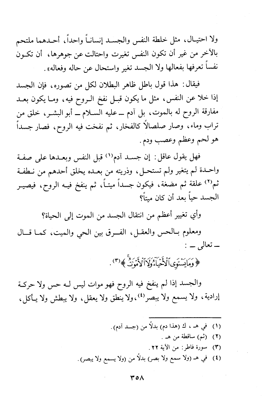 فَهَلْ يَقُولُ عَاقِلٌ: إِنَّ جَسَدَ آدَمَ قَبْلَ النَّفْسِ وَبَعْدَهَا عَلَى صِفَةٍ وَاحِدَةٍ لَمْ يَتَغَيَّرْ وَلَمْ تَسْتَحِلْ، وَذُرِّيَّتُهُ مِنْ بَعْدِهِ يُخْلَقُ أَحَدُهُمْ مِنْ نُطْفَةٍ، ثُمَّ عَلَقَةٍ، ثُمَّ مُضْغَةٍ، فَيَكُونُ جَسَدًا مَيِّتًا، ثُمَّ يُنْفَخُ فِيهِ الرُّوحُ فَيَصِيرُ الْجَسَدُ حَيًّا بَعْدَ أَنْ كَانَ مَيِّتًا؟