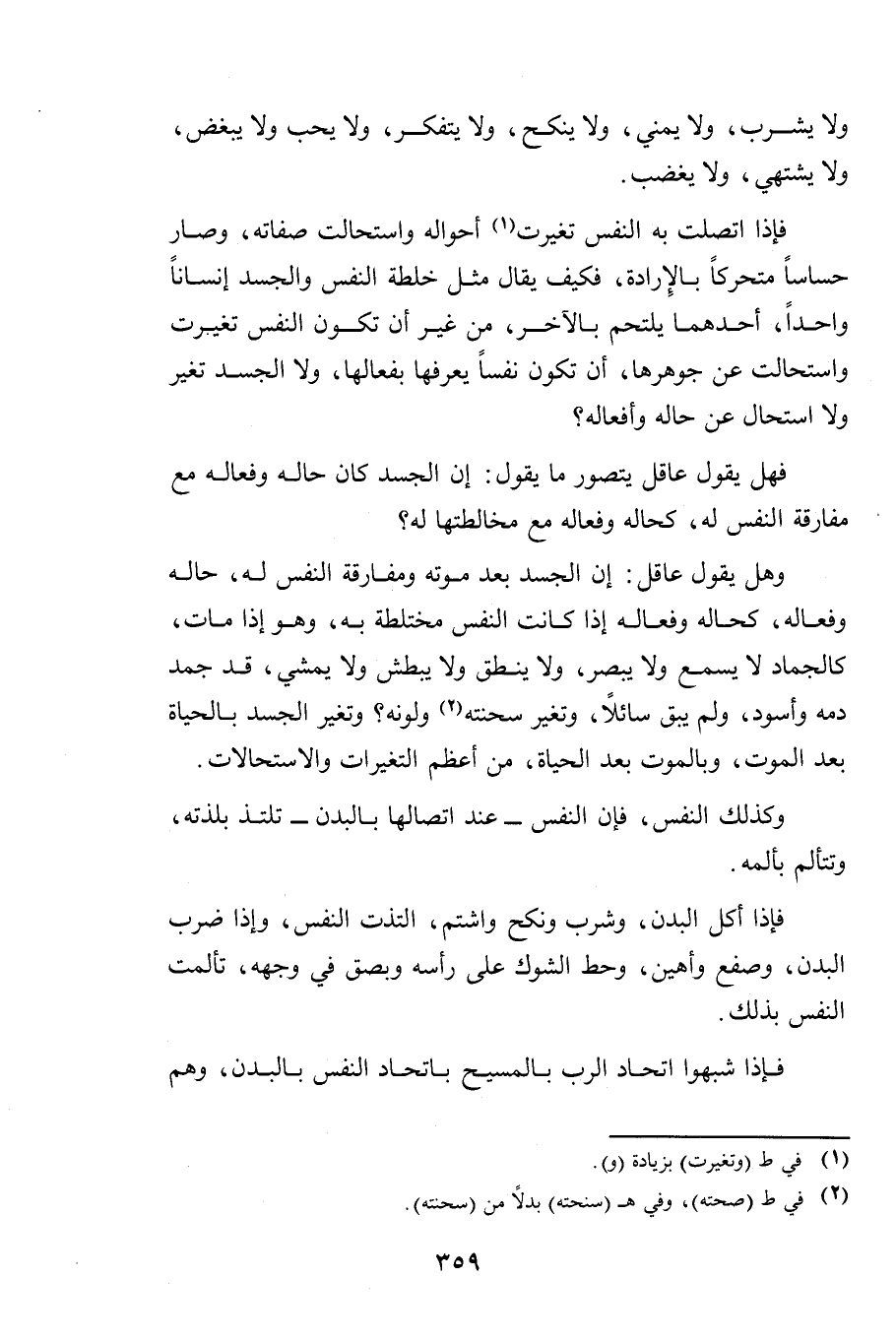 فَإِذَا اتَّصَلَتْ بِهِ النَّفْسُ، تَغَيَّرَتْ أَحْوَالُهُ وَاسْتَحَالَتْ صِفَاتُهُ، وَصَارَ حَسَّاسًا مُتَحَرِّكًا بِالْإِرَادَةِ، فَكَيْفَ يُقَالُ مِثْلُ خُلْطَةِ النَّفْسِ وَالْجَسَدِ إِنْسَانًا وَاحِدًا، أَحَدُهُمَا يَلْتَحِمُ بِالْآخَرِ مِنْ غَيْرِ أَنْ تَكُونَ النَّفْسُ تَغَيَّرَتْ وَاسْتَحَالَتْ عَنْ جَوْهَرِهَا، أَنْ تَكُونَ نَفْسًا يَعْرِفُهَا بِفِعَالِهَا، وَلَا الْجَسَدُ تَغَيَّرَ وَلَا اسْتَحَالَ عَنْ حَالِهِ وَأَفْعَالِهِ؟