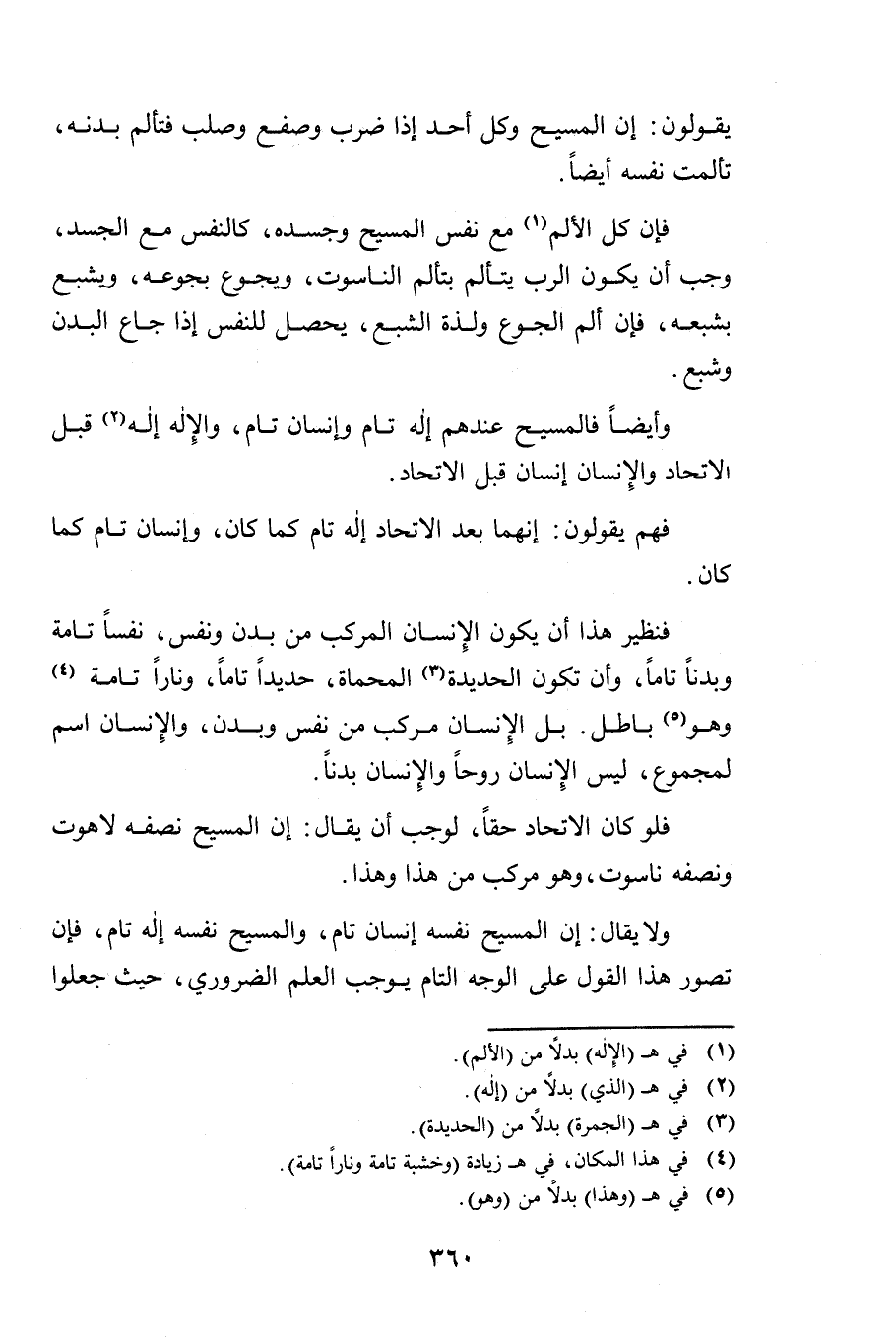 فَإِنْ كَانَ الْأَلَمُ مَعَ نَفْسِ الْمَسِيحِ وَجَسَدِهِ، كَالنَّفْسِ مَعَ الْجَسَدِ، وَجَبَ أَنْ يَكُونَ الرَّبُّ يَتَأَلَّمُ بِتَأَلُّمِ النَّاسُوتِ، وَيَجُوعُ بِجُوعِهِ وَيَشْبَعُ بِشِبَعِهِ، فَإِنَّ أَلَمَ الْجُوعِ وَلَذَّةَ الشِّبَعِ يَحْصُلُ لِلنَّفْسِ إِذَا جَاعَ الْبَدَنُ وَشَبِعَ.
