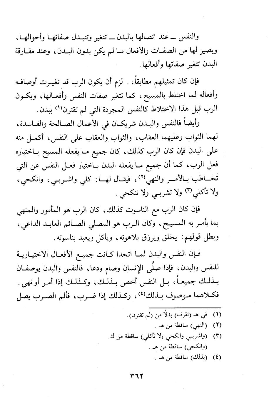 وَأَيْضًا فَالنَّفْسُ وَالْبَدَنُ شَرِيكَانِ فِي الْأَعْمَالِ الصَّالِحَةِ وَالْفَاسِدَةِ، لَهُمَا الثَّوَابُ وَعَلَيْهِمَا الْعِقَابُ، وَالثَّوَابُ وَالْعِقَابُ عَلَى النَّفْسِ أَكْمَلُ مِنْهُ عَلَى الْبَدَنِ، فَإِنْ كَانَ الرَّبُّ كَذَلِكَ، كَانَ جَمِيعُ مَا يَفْعَلُهُ الْمَسِيحُ بِاخْتِيَارِهِ فِعْلَ الرَّبِّ، كَمَا أَنَّ جَمِيعَ مَا يَفْعَلُهُ الْبَدَنُ بِاخْتِيَارِ فِعْلِ النَّفْسِ عَنِ الَّتِي تُخَاطَبُ بِالْأَمْرِ وَالنَّهْيِ، فَيُقَالُ لَهَا: كُلِي وَاشْرَبِي وَانْكِحِي، وَلَا تَأْكُلِي وَلَا تَشْرَبِي وَلَا تَنْكِحِي.