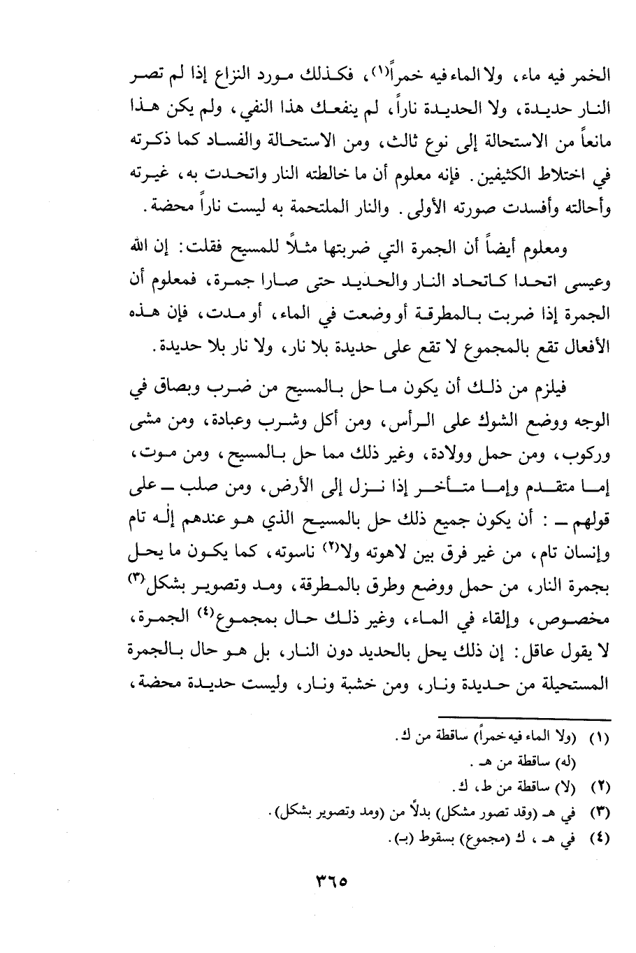 وَمَعْلُومٌ أَيْضًا أَنَّ الْجَمْرَةَ الَّتِي ضَرَبْتَهَا مَثَلًا لِلْمَسِيحِ فَقُلْتَ: إِنَّ اللَّهَ وَعِيسَى اتَّحَدَا كَاتِّحَادِ النَّارِ وَالْحَدِيدِ، حَتَّى صَارَا جَمْرَةً، فَمَعْلُومٌ أَنَّ الْجَمْرَةَ إِذَا ضُرِبَتْ بِالْمِطْرَقَةِ، أَوْ وُضِعَتْ فِي الْمَاءِ، أَوْ مُدَّتْ، فَإِنَّ هَذِهِ الْأَفْعَالَ تَقَعُ بِالْمَجْمُوعِ، لَا تَقَعُ عَلَى حَدِيدَةٍ بِلَا نَارٍ، وَلَا نَارٍ بِلَا حَدِيدَةٍ.