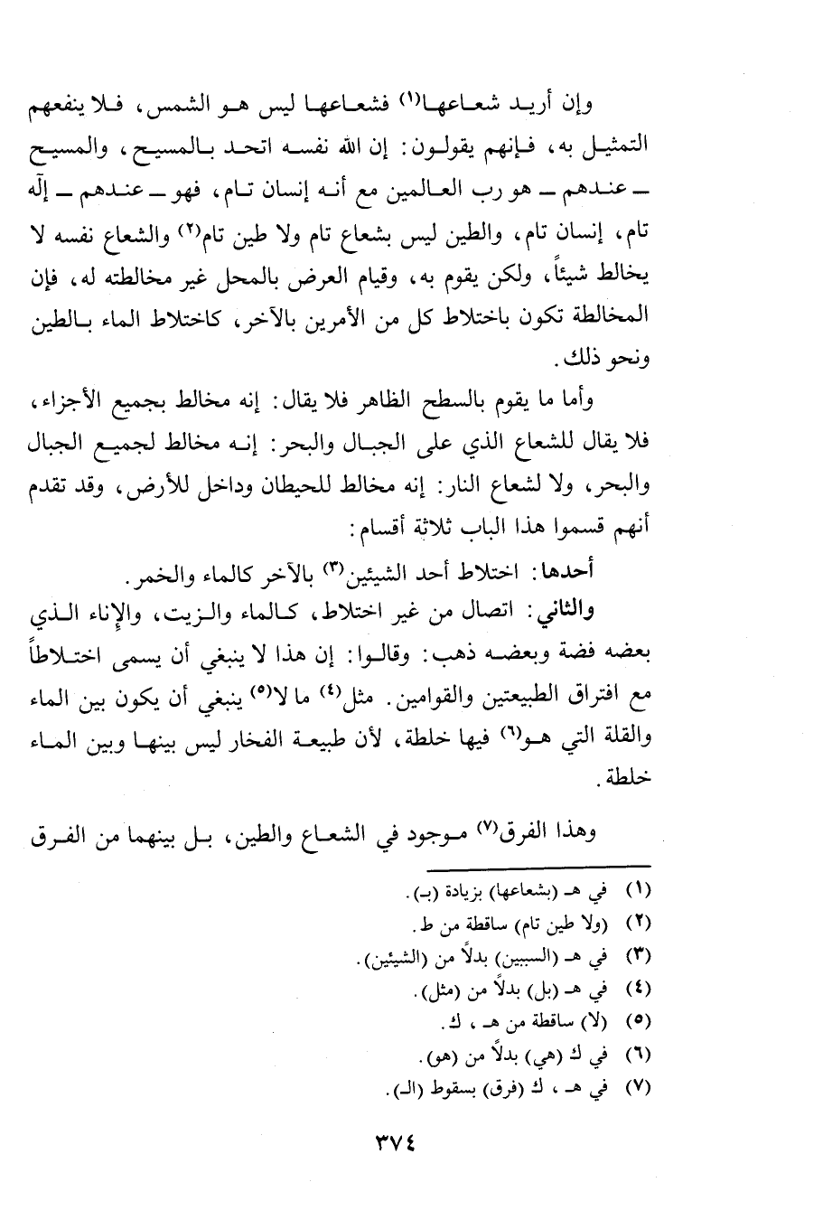 وَإِنْ أُرِيدَ شُعَاعُهَا، فَشُعَاهُا لَيْسَ هُوَ الشَّمْسُ، فَلَا يَنْفَعُهُمُ التَّمْثِيلُ بِهِ، فَإِنَّهُمْ يَقُولُونَ: إِنَّ اللَّهَ نَفْسَهُ اتَّحَدَ بِالْمَسِيحِ، وَالْمَسِيحُ - عِنْدَهُمْ - هُوَ رَبُّ الْعَالَمِينَ مَعَ أَنَّهُ إِنْسَانٌ تَامٌّ، فَهُوَ - عِنْدَهُمْ - إِلَهٌ تَامٌّ، إِنْسَانٌ تَامٌّ، وَالطِّينُ لَيْسَ بِشُعَاعٍ تَامٍّ، وَلَا طِينٍ تَامٍّ، وَالشُّعَاعُ نَفْسُهُ لَا يُخَالِطُ شَيْئًا، وَلَكِنْ يَقُومُ بِهِ، وَقِيَامُ الْعَرَضِ بِالْمَحَلِّ غَيْرُ مُخَالَطَتِهِ لَهُ، فَإِنَّ الْمُخَالَطَةَ تَكُونُ بِاخْتِلَاطِ كُلٍّ مِنَ الْأَمْرَيْنِ بِالْآخَرِ، كَاخْتِلَاطِ الْمَاءِ بِالطِّينِ وَنَحْوِ ذَلِكَ.