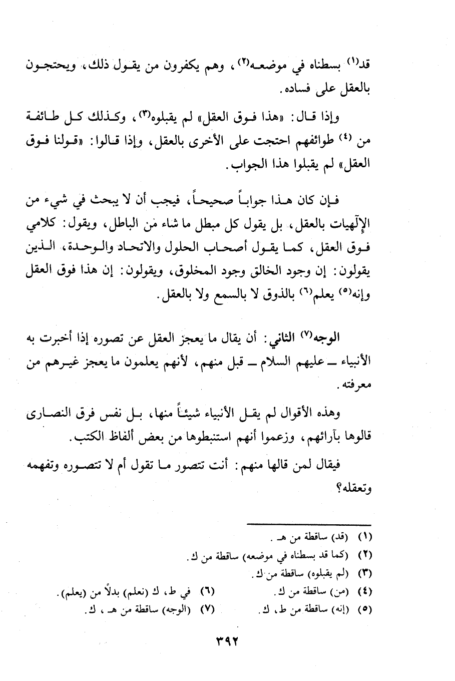 وَإِذَا قَالَ: (هَذَا فَوْقَ الْعَقْلِ) لَمْ يَقْبَلُوهُ، وَكَذَلِكَ كُلُّ طَائِفَةٍ مِنْ طَوَائِفِهِمُ احْتَجَّتْ عَلَى الْأُخْرَى بِالْعَقْلِ، وَإِذَا قَالُوا: (قَوْلُنَا فَوْقَ الْعَقْلِ) لَمْ يَقْبَلُوا هَذَا الْجَوَابَ.