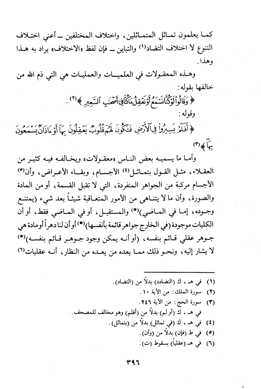 وَأَمَّا مَا يُسَمِّيهِ بَعْضُ النَّاسِ (مَعْقُولَاتٍ) وَيُخَالِفُهُ فِيهِ كَثِيرٌ مِنَ الْعُقَلَاءِ، مِثْلَ الْقَوْلِ بِتَمَاثُلِ الْأَجْسَامِ وَبَقَاءِ الْأَعْرَاضِ، وَأَنَّ الْأَجْسَامَ مُرَكَّبَةٌ مِنَ الْجَوَاهِرِ الْمُنْفَرِدَةِ الَّتِي لَا تَقْبَلُ الْقِسْمَةَ، أَوْ مِنَ الْمَادَّةِ وَالصُّورَةِ، وَأَنَّ مَا لَا يَتَنَاهَى مِنَ الْأُمُورِ الْمُتَعَاقِبَةِ شَيْئًا بَعْدَ شَيْءٍ، يَمْتَنِعُ وُجُودُهُ إِمَّا فِي الْمَاضِي وَالْمُسْتَقْبَلِ، أَوْ فِي الْمَاضِي فَقَطْ، أَوْ أَنَّ الْكُلِّيَّاتِ مَوْجُودَةٌ فِي الْخَارِجِ جَوَاهِرَ قَائِمَةً بِأَنْفُسِهَا، أَوْ أَنَّ لَنَا دَهْرًا أَوْ مَادَّةً هِيَ جَوْهَرٌ عَقْلِيٌّ قَائِمٌ بِنَفْسِهِ، أَوْ أَنَّهُ يُمْكِنُ وُجُودُ جَوْهَرٍ قَائِمٍ بِنَفْسِهِ لَا يُشَارُ إِلَيْهِ، وَنَحْوَ ذَلِكَ مِمَّا يَعُدُّهُ مَنْ يَعُدُّهُ مِنَ النُّظَّارِ أَنَّهُ عَقْلِيَّاتٌ