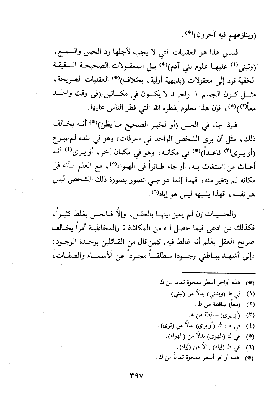 وَالْحِسِّيَّاتُ إِنْ لَمْ يُمَيَّزْ بَيْنَهَا بِالْعَقْلِ، وَإِلَّا فَالْحِسُّ يَغْلَطُ كَثِيرًا، فَكَذَلِكَ مَنِ ادَّعَى فِيمَا حَصَلَ لَهُ مِنَ الْمُكَاشَفَةِ وَالْمُخَاطَبَةِ أَمْرًا يُخَالِفُ صَرِيحَ الْعَقْلِ يُعْلَمُ أَنَّهُ غَالِطٌ فِيهِ، كَمَنْ قَالَ مِنَ الْقَائِلِينَ بِوَحْدَةِ الْوُجُودِ: (إِنِّي أَشْهَدُ بِبَاطِنِي وُجُودًا مُطْلَقًا مُجَرَّدًا عَنِ الْأَسْمَاءِ وَالصِّفَاتِ،