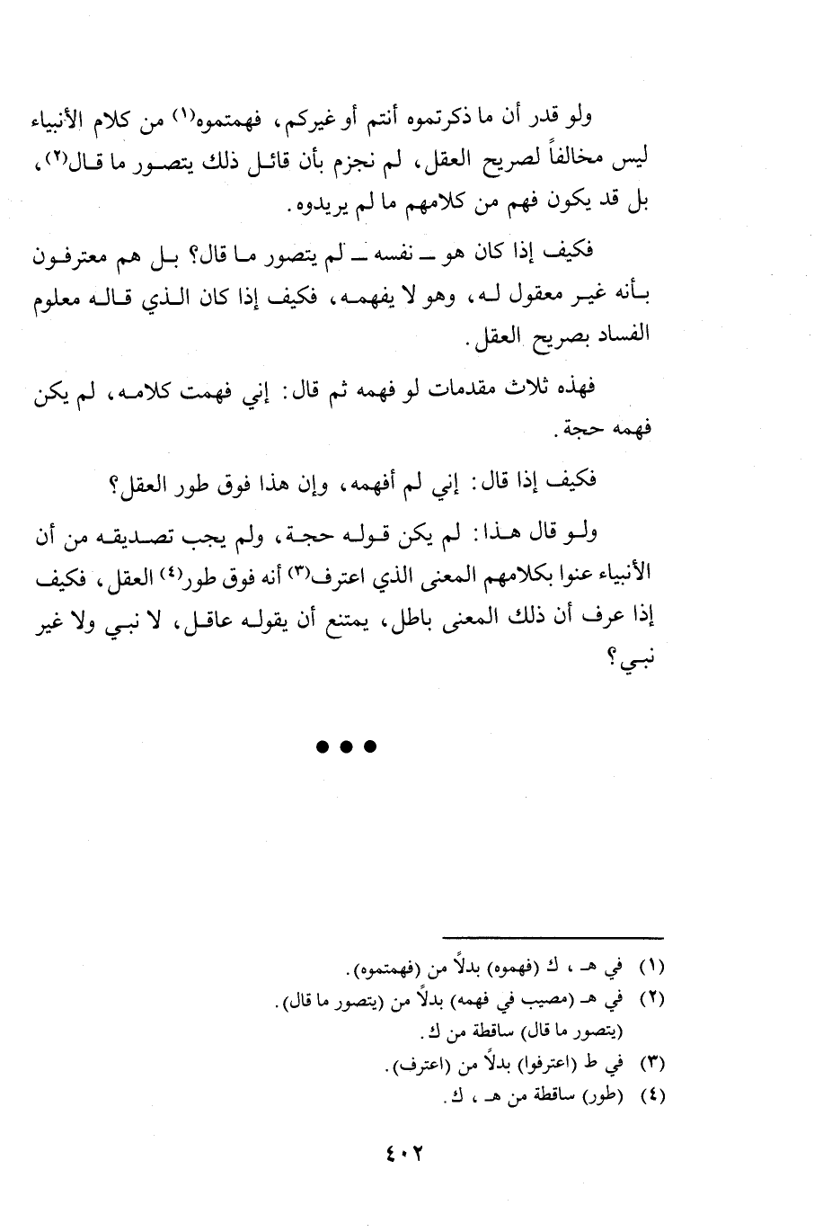 وَلَوْ قَالَ هَذَا لَمْ يَكُنْ قَوْلُهُ حُجَّةً، وَلَمْ يَجِبْ تَصْدِيقُهُ مِنْ أَنَّ الْأَنْبِيَاءَ عَنَوْا بِكَلَامِهِمُ الْمَعْنَى الَّذِي اعْتَرَفَ أَنَّهُ فَوْقَ طَوْرِ الْعَقْلِ، فَكَيْفَ إِذَا عُرِفَ أَنَّ ذَلِكَ الْمَعْنَى بَاطِلٌ يَمْتَنِعُ أَنْ يَقُولَهُ عَاقِلٌ لَا نَبِيٌّ وَلَا غَيْرُ نَبِيٍّ؟