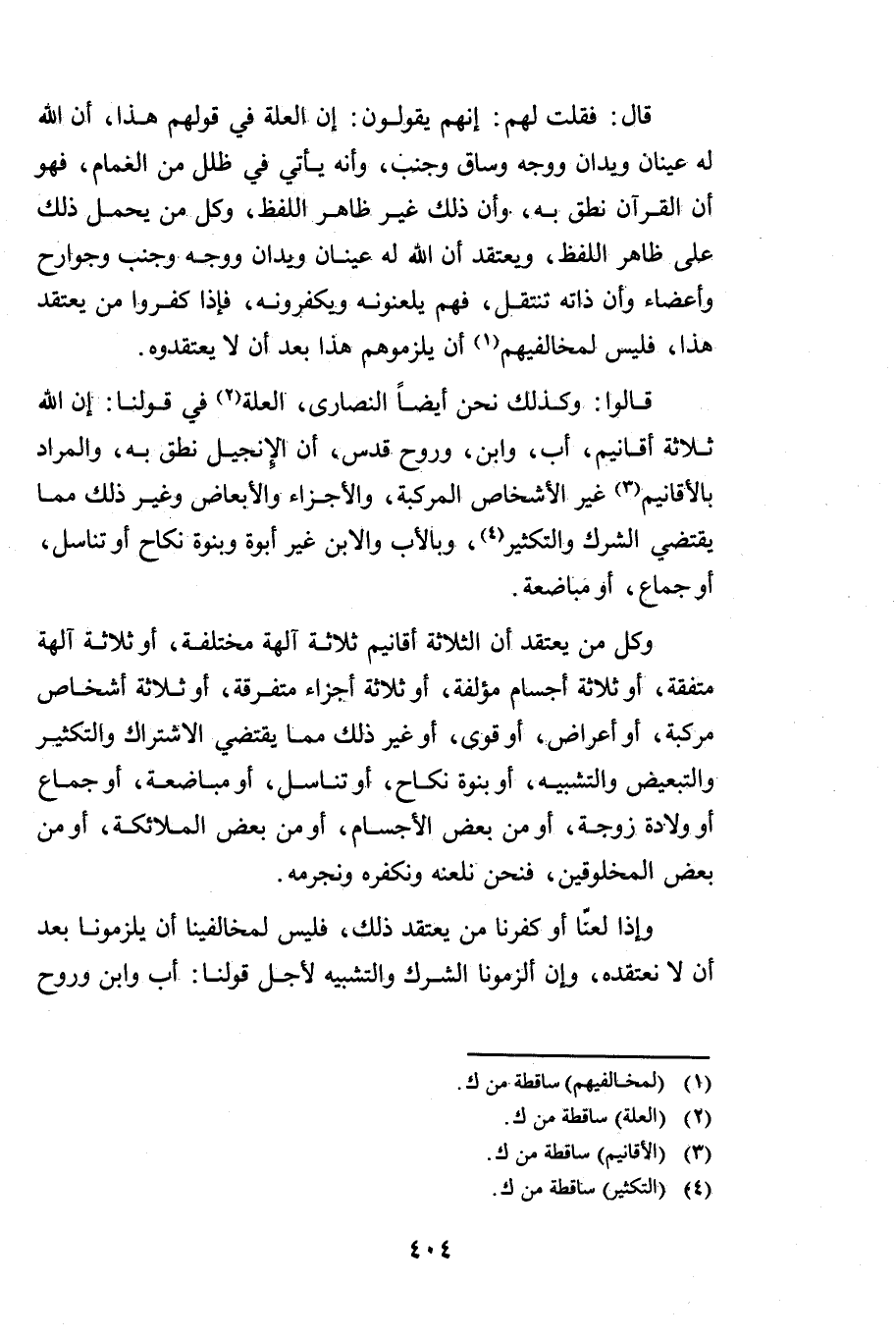 وَكُلُّ مَنْ يَعْتَقِدُ أَنَّ الثَّلَاثَةَ أَقَانِيمَ ثَلَاثَةُ آلِهَةٍ مُخْتَلِفَةٍ، أَوْ ثَلَاثَةُ آلِهَةٍ مُتَّفِقَةٍ، أَوْ ثَلَاثَةُ أَجْسَامٍ مُؤَلَّفَةٍ، أَوْ ثَلَاثَةُ أَجْزَاءٍ مُتَفَرِّقَةٍ، أَوْ ثَلَاثَةُ أَشْخَاصٍ مُرَكَّبَةٍ، أَوْ أَعْرَاضٌ، أَوْ قُوًى، أَوْ غَيْرُ ذَلِكَ مِمَّا يَقْتَضِي الِاشْتِرَاكَ وَالتَّكْثِيرَ وَالتَّبْعِيضَ وَالتَّشْبِيهَ، أَوْ بُنُوَّةُ نِكَاحٍ، أَوْ تَنَاسُلٍ، أَوْ مُبَاضَعَةٍ، أَوْ جِمَاعٍ، أَوْ وِلَادَةُ زَوْجَةٍ، أَوْ مِنْ بَعْضِ الْأَجْسَامِ، أَوْ مِنْ بَعْضِ الْمَلَائِكَةِ، أَوْ مِنْ بَعْضِ الْمَخْلُوقِينَ، فَنَحْنُ نَلْعَنُهُ وَنُكَفِّرُهُ وَنُجَرِّمُهُ.
