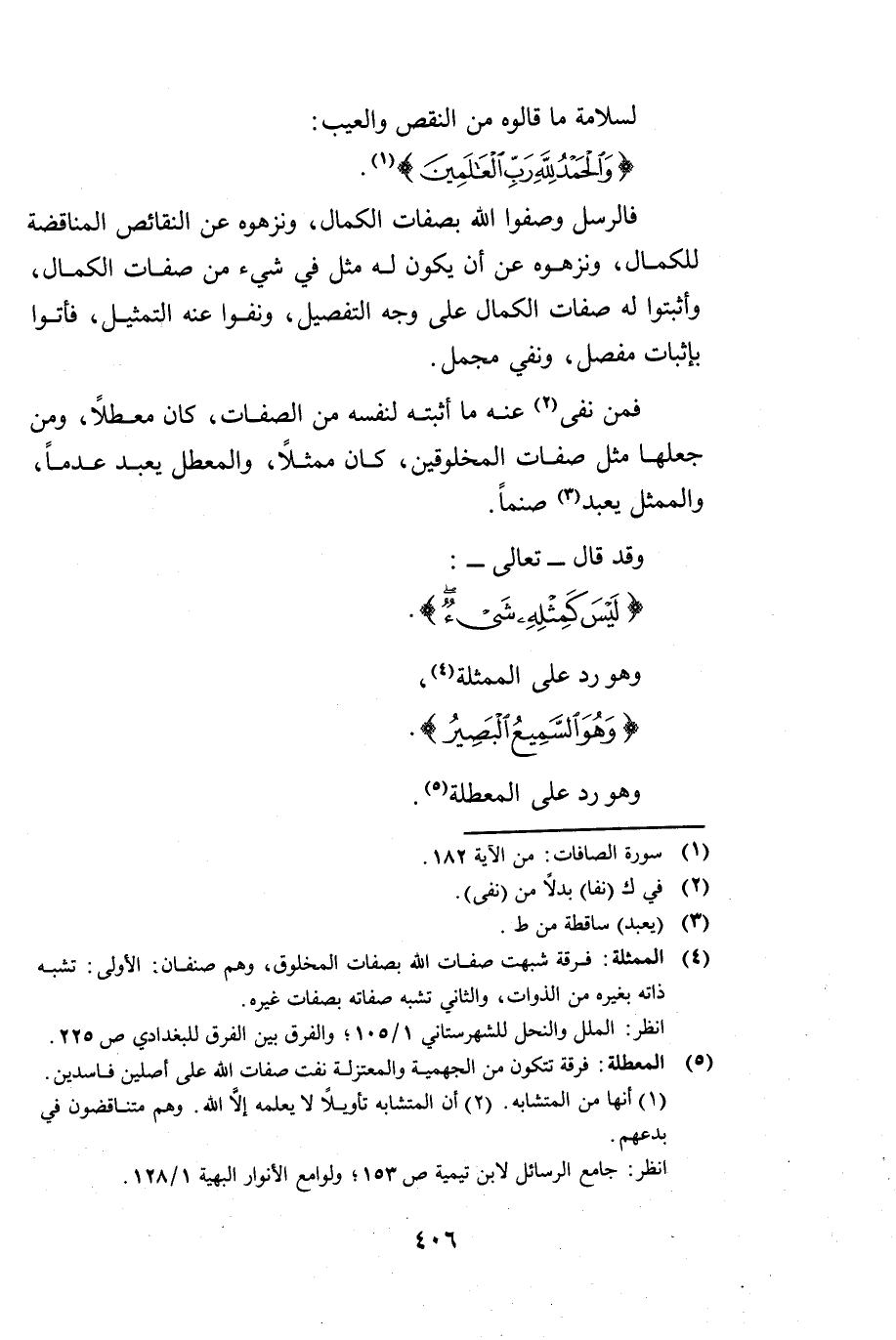 وَقَدْ قَالَ تَعَالَى: {لَيْسَ كَمِثْلِهِ شَيْءٌ} [الشورى: 11] وَهُوَ رَدٌّ عَلَى الْمُمَثِّلَةِ، {وَهُوَ السَّمِيعُ الْبَصِيرُ} [الشورى: 11] وَهُوَ رَدٌّ عَلَى الْمُعَطِّلَةِ.