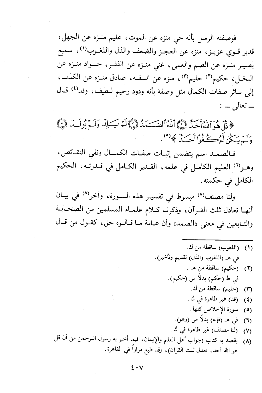 وَلَنَا مُصَنَّفٌ مَبْسُوطٌ فِي تَفْسِيرِ هَذِهِ السُّورَةِ، وَآخَرُ فِي بَيَانِ أَنَّهَا تُعَادِلُ ثُلُثَ الْقُرْآنِ، وَذَكَرْنَا كَلَامَ عُلَمَاءِ الْمُسْلِمِينَ مِنَ الصَّحَابَةِ وَالتَّابِعِينَ فِي مَعْنَى " الصَّمَدِ " وَأَنَّ عَامَّةَ مَا قَالُوهُ حَقٌّ، كَقَوْلِ مَنْ قَالَ