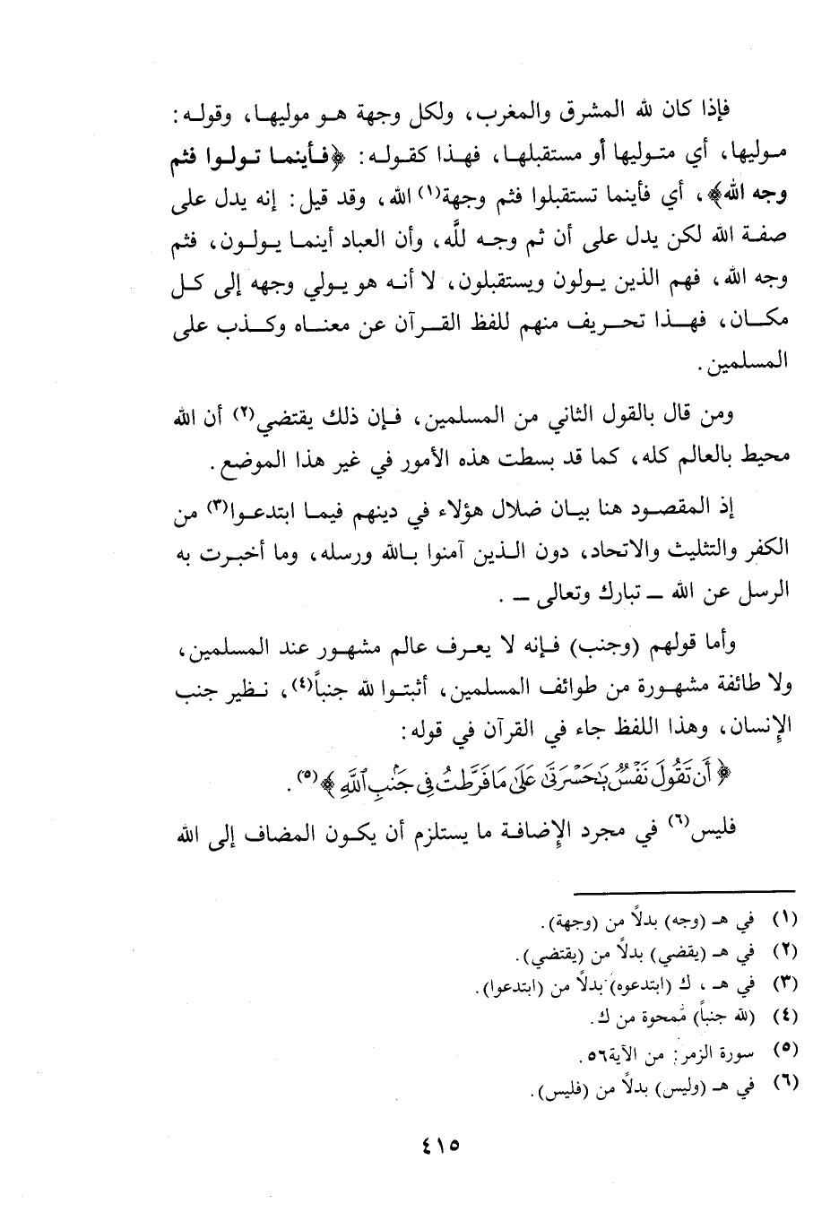 فَإِذَا كَانَ لِلَّهِ الْمَشْرِقُ وَالْمَغْرِبُ، {وَلِكُلٍّ وِجْهَةٌ هُوَ مُوَلِّيهَا} [البقرة: 148] وَقَوْلُهُ: (مُوَلِّيهَا) ; أَيْ مُتَوَلِّيهَا أَوْ مُسْتَقْبِلُهَا، فَهَذَا كَقَوْلِهِ: {فَأَيْنَمَا تُوَلُّوا فَثَمَّ وَجْهُ اللَّهِ} [البقرة: 115] أَيْ فَأَيْنَمَا تَسْتَقْبِلُوا فَثَمَّ وَجْهُ اللَّهُ. وَقَدْ قِيلَ: إِنَّهُ يَدُلُّ عَلَى صِفَةِ اللَّهِ، لَكِنْ يَدُلُّ عَلَى أَنَّ ثَمَّ وَجْهٌ لِلَّهِ، وَأَنَّ الْعِبَادَ أَيْنَمَا يُوَلُّونَ فَثَمَّ وَجْهُ اللَّهِ، فَهُمُ الَّذِينَ يُوَلُّونَ وَيَسْتَقْبِلُونَ، لَا أَنَّهُ هُوَ يُوَلِّي وَجْهَهُ إِلَى كُلِّ مَكَانٍ، فَهَذَا تَحْرِيفٌ مِنْهُمْ لِلَفْظِ الْقُرْآنِ عَنْ مَعْنَاهُ وَكَذِبٌ عَلَى الْمُسْلِمِينَ.