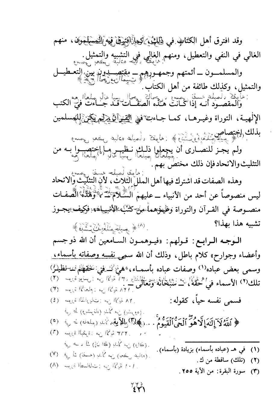 وَهَذِهِ الصِّفَاتُ قَدْ اشْتَرَكَ فِيهَا أَهْلُ الْمِلَلِ الثَّلَاثِ ; لِأَنَّ التَّثْلِيثَ وَالِاتِّحَادَ لَيْسَ مَنْصُوصًا عَنْ أَحَدٍ مِنَ الْأَنْبِيَاءِ - عَلَيْهِمُ السَّلَامُ - وَهَذِهِ الصِّفَاتُ مَنْصُوصَةٌ فِي الْقُرْآنِ وَالتَّوْرَاةِ وَغَيْرِهِمَا مِنْ كُتُبِ الْأَنْبِيَاءِ، فَكَيْفَ يَجُوزُ تَشْبِيهُ هَذَا بِهَذَا؟