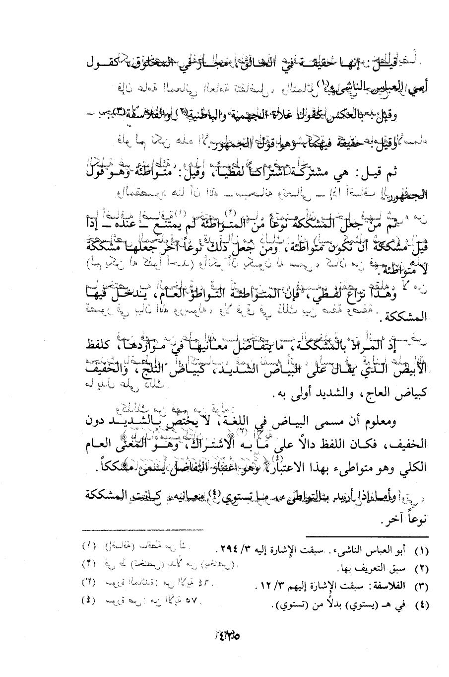 وَمَعْلُومٌ أَنَّ مُسَمَّى الْبَيَاضِ فِي اللُّغَةِ لَا يَخْتَصُّ بِالشَّدِيدِ دُونَ الْخَفِيفِ، فَكَانَ اللَّفْظُ دَالًّا عَلَى مَا بِهِ الِاشْتِرَاكُ، وَهُوَ الْمَعْنَى الْعَامُّ الْكُلِّيُّ، وَهُوَ مُتَوَاطِئٌ بِهَذَا الِاعْتِبَارِ، وَهُوَ بِاعْتِبَارِ التَّفَاضُلِ يُسَمَّى مُشَكِّكًا.