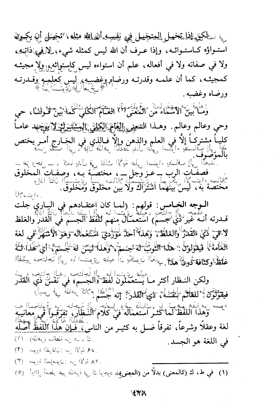 لَكِنْ إِذَا تَخَيَّلَ الْمُتَخَيِّلُ فِي نَفْسِهِ أَنَّ اللَّهَ مِثْلُهُ، تَخَيَّلَ أَنْ يَكُونَ اسْتِوَاؤُهُ كَاسْتِوَائِهِ، وَإِذَا عَرَفَ أَنَّ اللَّهَ لَيْسَ كَمِثْلِهِ شَيْءٌ لَا فِي ذَاتِهِ وَلَا فِي صِفَاتِهِ وَلَا فِي أَفْعَالِهِ، عَلِمَ أَنَّ اسْتِوَاءَهُ لَيْسَ كَاسْتِوَائِهِ، وَمَجِيئَهُ كَمَجِيئِهِ، كَمَا أَنَّ عِلْمَهُ وَقُدْرَتَهُ وَرِضَاهُ وَغَضَبَهُ، لَيْسَ كَعِلْمِهِ وَقُدْرَتِهِ وَرِضَاهُ وَغَضَبِهِ.