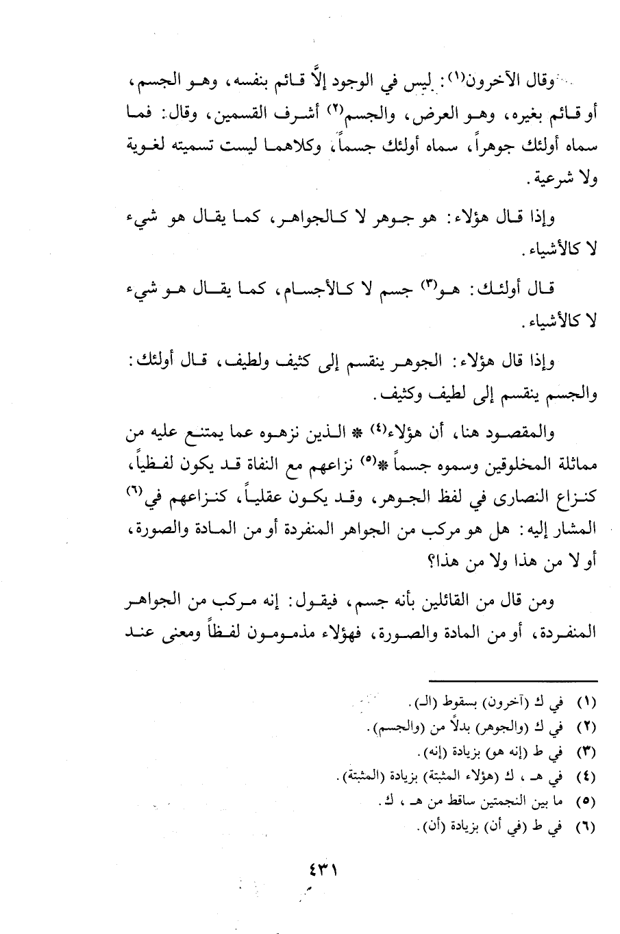 وَقَالَ الْآخَرُونَ: لَيْسَ فِي الْوُجُودِ إِلَّا قَائِمٌ بِنَفْسِهِ، وَهُوَ الْجِسْمُ أَوْ قَائِمٌ بِغَيْرِهِ، وَهُوَ الْعَرَضُ، وَالْجِسْمُ أَشْرَفُ الْقِسْمَيْنِ. وَقَالَ: فَمَا سَمَّاهُ أُولَئِكَ جَوْهَرًا، سَمَّاهُ أُولَئِكَ جِسْمًا، وَكِلَاهُمَا لَيْسَتْ تَسْمِيَتُهُ لُغَوِيَّةً وَلَا شَرْعِيَّةً.