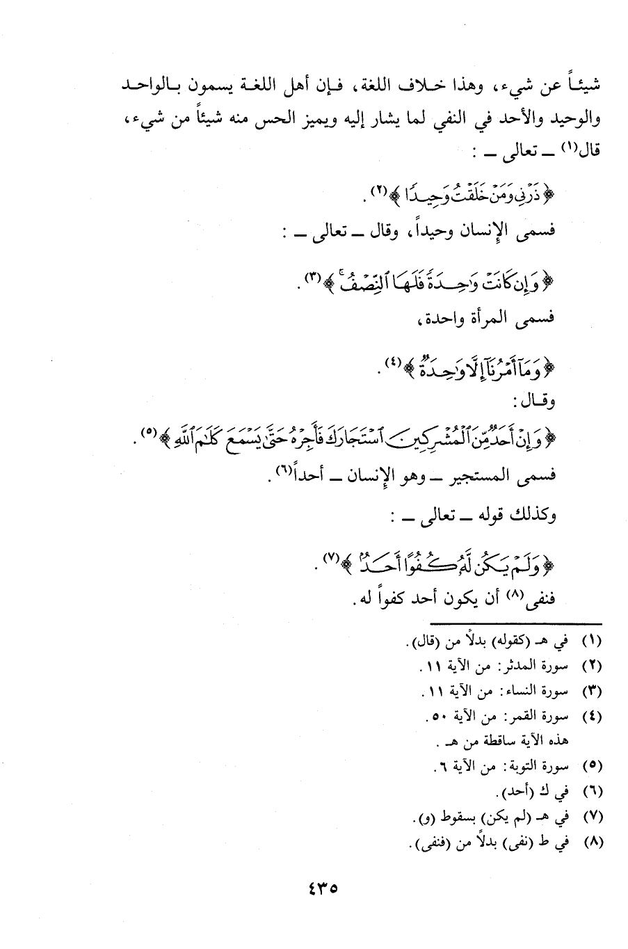 شَيْئًا عَنْ شَيْءٍ، وَهَذَا خِلَافُ اللُّغَةِ، فَإِنَّ أَهْلَ اللُّغَةِ يُسَمُّونَ بِالْوَاحِدِ وَالْوَحِيدِ وَالْأَحَدِ فِي النَّفْيِ لِمَا يُشَارُ إِلَيْهِ وَيُمَيِّزُ الْحِسُّ مِنْهُ شَيْئًا مِنْ شَيْءٍ، قَالَ تَعَالَى: {ذَرْنِي وَمَنْ خَلَقْتُ وَحِيدًا} [المدثر: 11] فَسَمَّى الْإِنْسَانَ وَحِيدًا، وَقَالَ تَعَالَى: {وَإِنْ كَانَتْ وَاحِدَةً فَلَهَا النِّصْفُ} [النساء: 11] فَسَمَّى الْمَرْأَةَ وَاحِدَةً، {وَمَا أَمْرُنَا إِلَّا وَاحِدَةٌ} [القمر: 50] وَقَالَ: {وَإِنْ أَحَدٌ مِنَ الْمُشْرِكِينَ اسْتَجَارَكَ فَأَجِرْهُ حَتَّى يَسْمَعَ كَلَامَ اللَّهِ} [التوبة: 6] فَسَمَّى الْمُسْتَجِيرَ وَهُوَ الْإِنْسَانُ أَحَدًا.