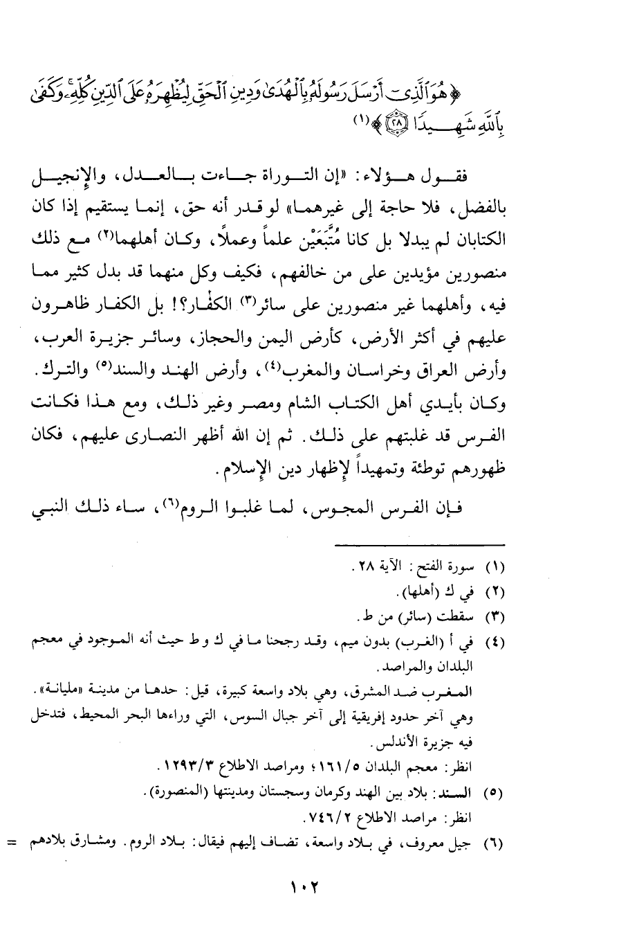فَقَوْلُ هَؤُلَاءِ: " إِنَّ التَّوْرَاةَ جَاءَتْ بِالْعَدْلِ، وَالْإِنْجِيلَ بِالْفَضْلِ فَلَا حَاجَةَ إِلَى غَيْرِهِمَا، لَوْ قُدِّرَ أَنَّهُ حَقٌّ. إِنَّمَا يَسْتَقِيمُ إِذَا كَانَ الْكِتَابَانِ لَمْ يُبَدَّلَا، بَلْ كَانَا مُتَّبَعَيْنِ عِلْمًا وَعَمَلًا، وَكَانَ أَهْلُهُمَا مَعَ ذَلِكَ مَنْصُورِينَ مُؤَيَّدِينَ عَلَى مَنْ خَالَفَهُمْ، فَكَيْفَ وَكُلٌّ مِنْهُمَا قَدْ بُدِّلَ كَثِيرٌ مِمَّا فِيهِ، وَأَهْلُهُمَا غَيْرُ مَنْصُورِينَ عَلَى سَائِرِ الْكُفَّارِ، بَلِ الْكُفَّارُ ظَاهِرُونَ عَلَيْهِمْ فِي أَكْثَرِ الْأَرْضِ؛ كَأَرْضِ الْيَمَنِ وَالْحِجَازِ وَسَائِرِ جَزِيرَةِ الْعَرَبِ وَأَرْضِ الْعِرَاقِ وَخُرَاسَانَ وَالْمَغْرِبِ وَأَرْضِ الْهِنْدِ وَالسِّنْدِ وَالتُّرْكِ، وَكَانَ بِأَيْدِي أَهْلِ الْكِتَابِ الشَّامُ وَمِصْرُ وَغَيْرُ ذَلِكَ، وَمَعَ هَذَا فَكَانَتِ الْفُرْسُ قَدْ غَلَبَتْهُمْ عَلَى ذَلِكَ،، ثُمَّ إِنَّ اللَّهَ أَظْهَرَ النَّصَارَى عَلَيْهِمْ، فَكَانَ ظُهُورُهُمْ تَوْطِئَةً وَتَمْهِيدًا لِإِظْهَارِ دِينِ الْإِسْلَامِ.